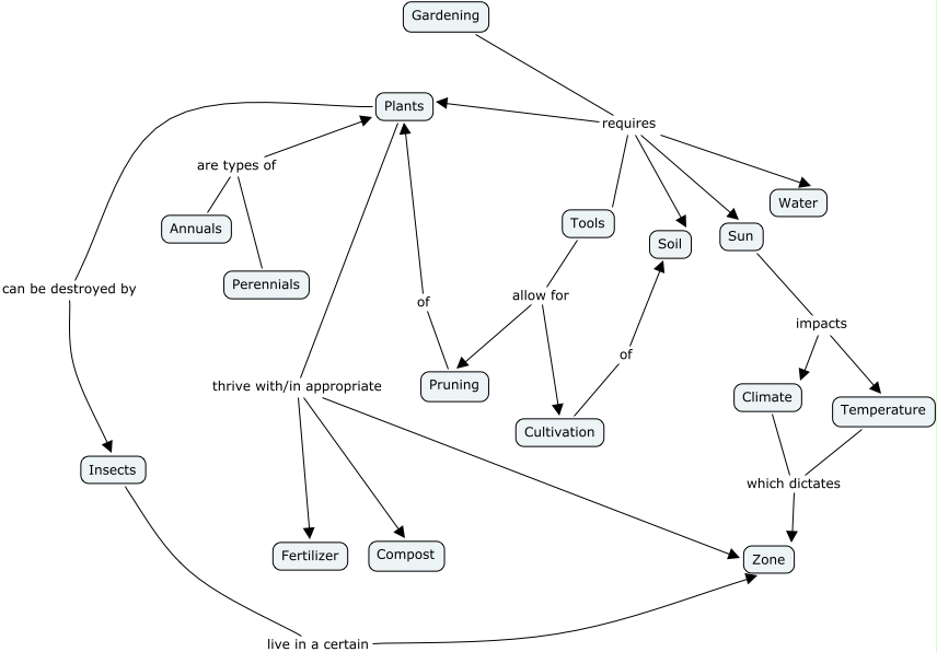 This Concept Map, created with IHMC CmapTools, has information related to: Barkauskas - Hobby Map, Perennials are types of Plants, Plants can be destroyed by Insects, Tools allow for Pruning, Sun impacts Temperature, Annuals are types of Plants, Plants thrive with/in appropriate Fertilizer, Gardening requires Sun, Plants thrive with/in appropriate Zone, Insects live in a certain Zone, Plants thrive with/in appropriate Compost, Tools allow for Cultivation, Climate which dictates Zone, Cultivation of Soil, Sun impacts Climate, Gardening requires Soil, Gardening requires Water, Pruning of Plants, Gardening requires Tools, Gardening requires Plants, Temperature which dictates Zone