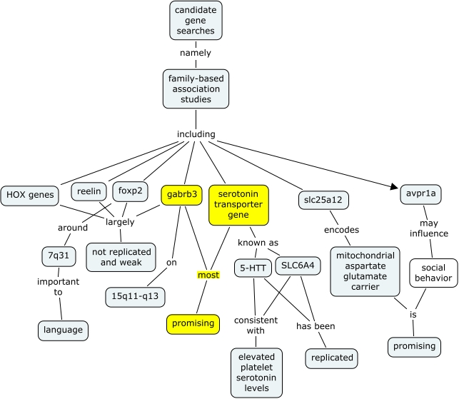 Autism Candidate genes - JDN rev, family-based association studies including reelin, mitochondrial aspartate glutamate carrier is promising, social behavior is promising, gabrb3 on 15q11-q13, family-based association studies including HOX genes, candidate gene searches namely family-based association studies, reelin largely not replicated and weak, family-based association studies including slc25a12, gabrb3 largely not replicated and weak, serotonin transporter gene known as 5-HTT