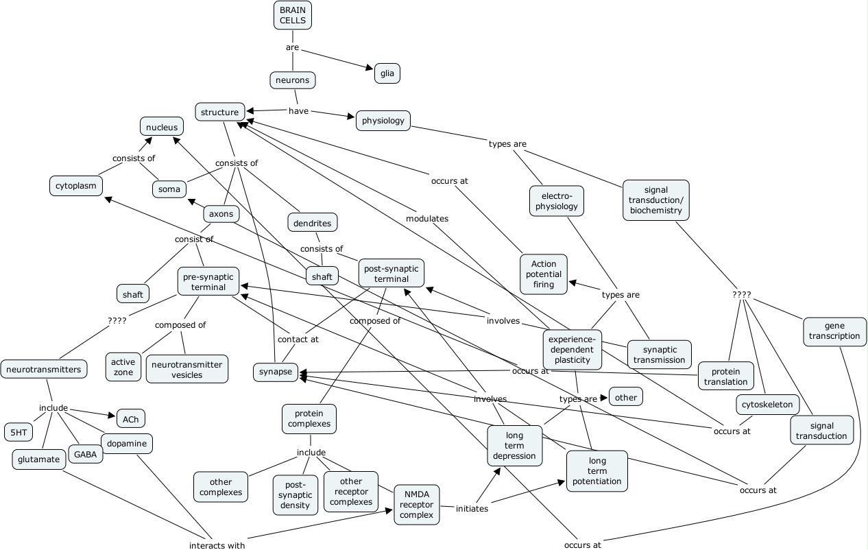 electro- physiology types are Action potential firing,neurotransmitters include dopamine,synaptic transmission involves pre-synaptic terminal,long term potentiation involves pre-synaptic terminal,structure consists of soma,neurotransmitters include glutamate,pre-synaptic terminal composed of active zone,pre-synaptic terminal composed of neurotransmitter vesicles,NMDA receptor complex initiates long term potentiation,post-synaptic terminal composed of protein complexes,signal transduction/ biochemistry ???? cytoskeleton,experience- dependent plasticity types are long term depression,long term depression involves pre-synaptic terminal,neurotransmitters include GABA,experience- dependent plasticity modulates structure,Action potential firing occurs at structure,protein complexes include post- synaptic density,pre-synaptic terminal contact at synapse,physiology types are signal transduction/ biochemistry,long term depression involves post-synaptic terminal,electro- physiology types are synaptic transmission,signal transduction/ biochemistry ???? protein translation,cytoskeleton occurs at synapse,BRAIN CELLS are neurons,neurotransmitters include 5HT,neurotransmitters include ACh,post-synaptic terminal contact at synapse,soma consists of cytoplasm,signal transduction/ biochemistry ???? gene transcription,structure consists of synapse,protein complexes include other complexes,electro- physiology types are experience- dependent plasticity,long term potentiation involves post-synaptic terminal,dendrites consists of post-synaptic terminal,protein translation occurs at cytoplasm,protein translation occurs at synapse,neurons have structure,structure consists of dendrites,experience- dependent plasticity types are other,dopamine interacts with NMDA receptor complex,signal transduction occurs at soma,dendrites consists of shaft,gene transcription occurs at nucleus,protein complexes include NMDA receptor complex,axons consist of pre-synaptic terminal,protein complexes include other receptor complexes,signal transduction occurs at synapse,cytoskeleton occurs at structure,glutamate interacts with NMDA receptor complex,neurons have physiology,BRAIN CELLS are glia,structure consists of axons,signal transduction/ biochemistry ???? signal transduction,pre-synaptic terminal ???? neurotransmitters,soma consists of nucleus,synaptic transmission involves post-synaptic terminal,NMDA receptor complex initiates long term depression,axons consist of shaft,physiology types are electro- physiology,experience- dependent plasticity types are long term potentiation