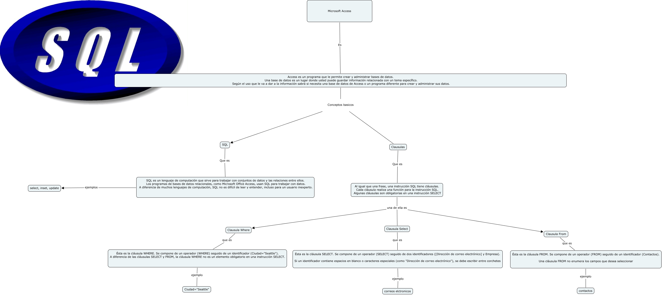 Este Cmap, tiene información relacionada con: cristian becerra 072, Al igual que una frase, una instrucción SQL tiene cláusulas. Cada cláusula realiza una función para la instrucción SQL. Algunas cláusulas son obligatorias en una instrucción SELECT una de ella es Clausula Select, Ésta es la cláusula FROM. Se compone de un operador (FROM) seguido de un identificador (Contactos). Una cláusula FROM no enumera los campos que desea seleccionar ejemplo contactos, Al igual que una frase, una instrucción SQL tiene cláusulas. Cada cláusula realiza una función para la instrucción SQL. Algunas cláusulas son obligatorias en una instrucción SELECT una de ella es Clausula From, Clausula From que es Ésta es la cláusula FROM. Se compone de un operador (FROM) seguido de un identificador (Contactos). Una cláusula FROM no enumera los campos que desea seleccionar, Microsoft Access Es Access es un programa que le permite crear y administrar bases de datos. Una base de datos es un lugar donde usted puede guardar información relacionada con un tema específico. Según el uso que le va a dar a la información sabrá si necesita una base de datos de Access o un programa diferente para crear y administrar sus datos., Access es un programa que le permite crear y administrar bases de datos. Una base de datos es un lugar donde usted puede guardar información relacionada con un tema específico. Según el uso que le va a dar a la información sabrá si necesita una base de datos de Access o un programa diferente para crear y administrar sus datos. Conceptos basicos SQL, Ésta es la cláusula WHERE. Se compone de un operador (WHERE) seguido de un identificador (Ciudad="Seattle"). A diferencia de las cláusulas SELECT y FROM, la cláusula WHERE no es un elemento obligatorio en una instrucción SELECT. ejemplo Ciudad="Seattle", SQL Que es SQL es un lenguaje de computación que sirve para trabajar con conjuntos de datos y las relaciones entre ellos. Los programas de bases de datos relacionales, como Microsoft Office Access, usan SQL para trabajar con datos. A diferencia de muchos lenguajes de computación, SQL no es difícil de leer y entender, incluso para un usuario inexperto., SQL es un lenguaje de computación que sirve para trabajar con conjuntos de datos y las relaciones entre ellos. Los programas de bases de datos relacionales, como Microsoft Office Access, usan SQL para trabajar con datos. A diferencia de muchos lenguajes de computación, SQL no es difícil de leer y entender, incluso para un usuario inexperto. ejemplos select, inset, update, Ésta es la cláusula SELECT. Se compone de un operador (SELECT) seguido de dos identificadores ([Dirección de correo electrónico] y Empresa). Si un identificador contiene espacios en blanco o caracteres especiales (como "Dirección de correo electrónico"), se debe escribir entre corchetes ejemplo correos elctronicos, Al igual que una frase, una instrucción SQL tiene cláusulas. Cada cláusula realiza una función para la instrucción SQL. Algunas cláusulas son obligatorias en una instrucción SELECT una de ella es Clausula Where, Clausulas Que es Al igual que una frase, una instrucción SQL tiene cláusulas. Cada cláusula realiza una función para la instrucción SQL. Algunas cláusulas son obligatorias en una instrucción SELECT, Clausula Select que es Ésta es la cláusula SELECT. Se compone de un operador (SELECT) seguido de dos identificadores ([Dirección de correo electrónico] y Empresa). Si un identificador contiene espacios en blanco o caracteres especiales (como "Dirección de correo electrónico"), se debe escribir entre corchetes, Access es un programa que le permite crear y administrar bases de datos. Una base de datos es un lugar donde usted puede guardar información relacionada con un tema específico. Según el uso que le va a dar a la información sabrá si necesita una base de datos de Access o un programa diferente para crear y administrar sus datos. Conceptos basicos Clausulas, Clausula Where que es Ésta es la cláusula WHERE. Se compone de un operador (WHERE) seguido de un identificador (Ciudad="Seattle"). A diferencia de las cláusulas SELECT y FROM, la cláusula WHERE no es un elemento obligatorio en una instrucción SELECT.