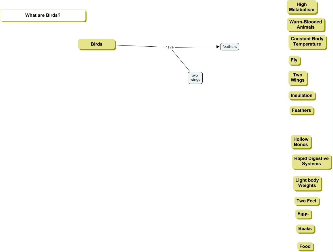 This Concept Map, created with IHMC CmapTools, has information related to: BIRD TWO, Birds have two wings, Birds have feathers