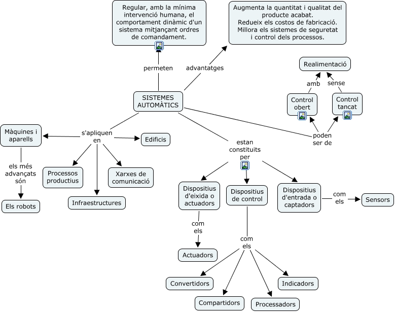 Aquest mapa conceptual conté informació relacionada amb: Control_Robòtica, Dispositius d'entrada o captadors com els Sensors, Dispositius de control com els Processadors, SISTEMES AUTOMÀTICS s'apliquen en Edificis, Dispositius de control com els Compartidors, SISTEMES AUTOMÀTICS s'apliquen en Xarxes de comunicació, SISTEMES AUTOMÀTICS estan constituits per Dispositius d'entrada o captadors, Dispositius de control com els Indicadors, Control obert amb Realimentació, SISTEMES AUTOMÀTICS s'apliquen en Processos productius, SISTEMES AUTOMÀTICS estan constituits per Dispositius de control, Dispositius de control com els Convertidors, Dispositius d'eixida o actuadors com els Actuadors, SISTEMES AUTOMÀTICS estan constituits per Dispositius d'eixida o actuadors, SISTEMES AUTOMÀTICS s'apliquen en Màquines i aparells, SISTEMES AUTOMÀTICS poden ser de Control obert, SISTEMES AUTOMÀTICS s'apliquen en Infraestructures, SISTEMES AUTOMÀTICS advantatges Augmenta la quantitat i qualitat del producte acabat. Redueix els costos de fabricació. Millora els sistemes de seguretat i control dels processos., Control tancat sense Realimentació, SISTEMES AUTOMÀTICS poden ser de Control tancat, Màquines i aparells els més advançats són Els robots