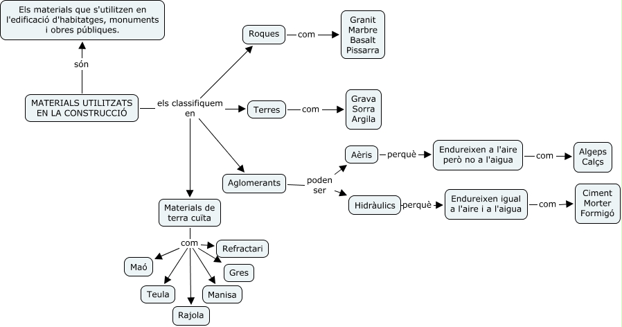 Aquest mapa conceptual conté informació relacionada amb: Materials de construcció, Endureixen a l'aire però no a l'aigua com Algeps Calçs, MATERIALS UTILITZATS EN LA CONSTRUCCIÓ els classifiquem en Aglomerants, Hidràulics perquè Endureixen igual a l'aire i a l'aigua, MATERIALS UTILITZATS EN LA CONSTRUCCIÓ els classifiquem en Materials de terra cuïta, Materials de terra cuïta com Manisa, Endureixen igual a l'aire i a l'aigua com Ciment Morter Formigó, Aglomerants poden ser Aèris, MATERIALS UTILITZATS EN LA CONSTRUCCIÓ són Els materials que s'utilitzen en l'edificació d'habitatges, monuments i obres públiques., MATERIALS UTILITZATS EN LA CONSTRUCCIÓ els classifiquem en Roques, Roques com Granit Marbre Basalt Pissarra, Aèris perquè Endureixen a l'aire però no a l'aigua, Materials de terra cuïta com Teula, Aglomerants poden ser Hidràulics, Materials de terra cuïta com Gres, Materials de terra cuïta com Refractari, Materials de terra cuïta com Maó, Terres com Grava Sorra Argila, MATERIALS UTILITZATS EN LA CONSTRUCCIÓ els classifiquem en Terres, Materials de terra cuïta com Rajola