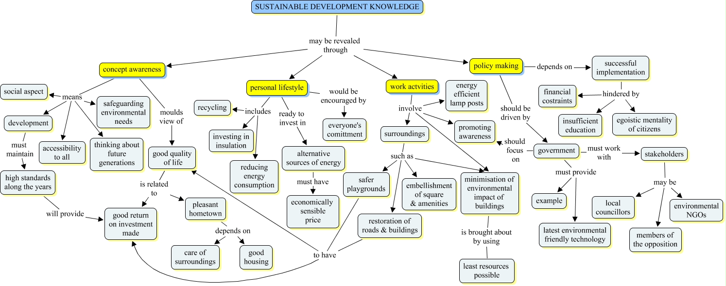 This Concept Map, created with IHMC CmapTools, has information related to: Sean, alternative sources of energy must have economically sensible price, concept awareness means thinking about future generations, successful implementation hindered by egoistic mentality of citizens, personal lifestyle would be encouraged by everyone's comittment, development must maintain high standards along the years, government must provide example, stakeholders may be members of the opposition, concept awareness means accessibility to all, high standards along the years will provide good return on investment made, safer playgrounds to have good quality of life, SUSTAINABLE DEVELOPMENT KNOWLEDGE may be revealed through personal lifestyle, successful implementation hindered by financial costraints, work actvities involve energy efficient lamp posts, SUSTAINABLE DEVELOPMENT KNOWLEDGE may be revealed through policy making, stakeholders may be local councillors, policy making should be driven by government, concept awareness means development, SUSTAINABLE DEVELOPMENT KNOWLEDGE may be revealed through work actvities, restoration of roads & buildings to have good return on investment made, personal lifestyle ready to invest in alternative sources of energy