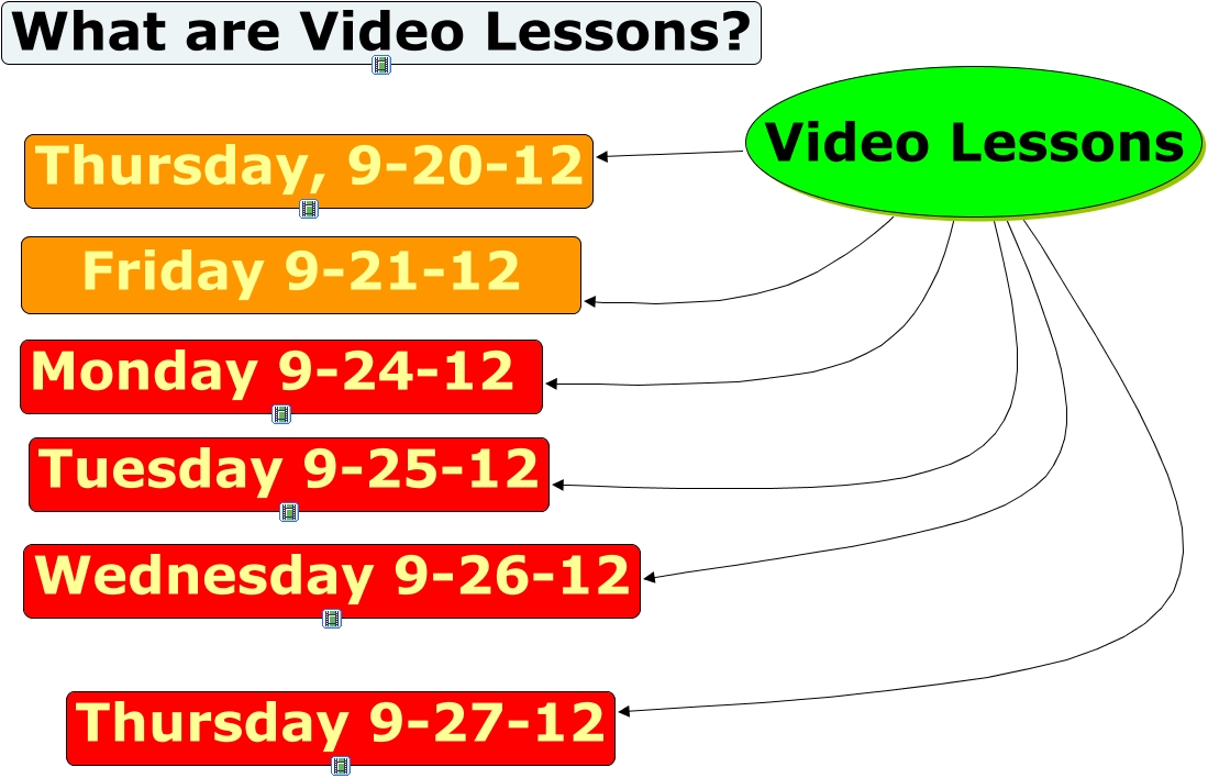 This Concept Map, created with IHMC CmapTools, has information related to: LESSONS BY DATE, Video Lessons Thursday 9-27-12, Video Lessons Monday 9-24-12, Video Lessons Thursday, 9-20-12, Video Lessons Tuesday 9-25-12, Video Lessons Wednesday 9-26-12, Video Lessons Friday 9-21-12