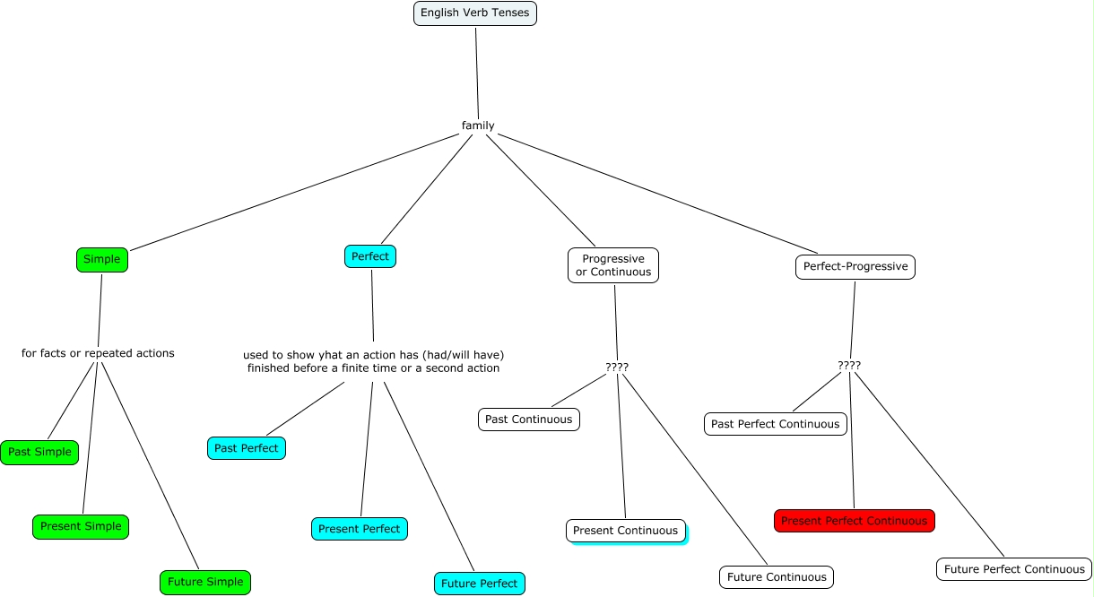 Este Cmap, tiene información relacionada con: English verbs tenses, Perfect-Progressive ???? Future Perfect Continuous, English Verb Tenses family Perfect, Perfect used to show yhat an action has (had/will have) finished before a finite time or a second action Present Perfect, Simple for facts or repeated actions Past Simple, Progressive or Continuous ???? Present Continuous, Progressive or Continuous ???? Future Continuous, English Verb Tenses family Perfect-Progressive, Simple for facts or repeated actions Future Simple, Simple for facts or repeated actions Present Simple, English Verb Tenses family Simple, Perfect used to show yhat an action has (had/will have) finished before a finite time or a second action Past Perfect, Progressive or Continuous ???? Past Continuous, Perfect used to show yhat an action has (had/will have) finished before a finite time or a second action Future Perfect, Perfect-Progressive ???? Past Perfect Continuous, English Verb Tenses family Progressive or Continuous, Perfect-Progressive ???? Present Perfect Continuous