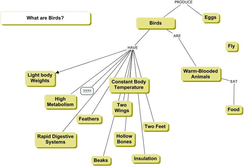 This Concept Map, created with IHMC CmapTools, has information related to: BIRDS THREE, Birds HAVE Beaks, Birds PRODUCE Eggs, Birds HAVE ????, Birds HAVE Rapid Digestive Systems, Birds HAVE High Metabolism, Birds HAVE Insulation, Birds HAVE Two Wings, Birds HAVE Constant Body Temperature, Birds HAVE Light body Weights, Birds HAVE Feathers, Birds HAVE Two Feet, Birds ARE Warm-Blooded Animals, Warm-Blooded Animals EAT Food, Birds HAVE Hollow Bones