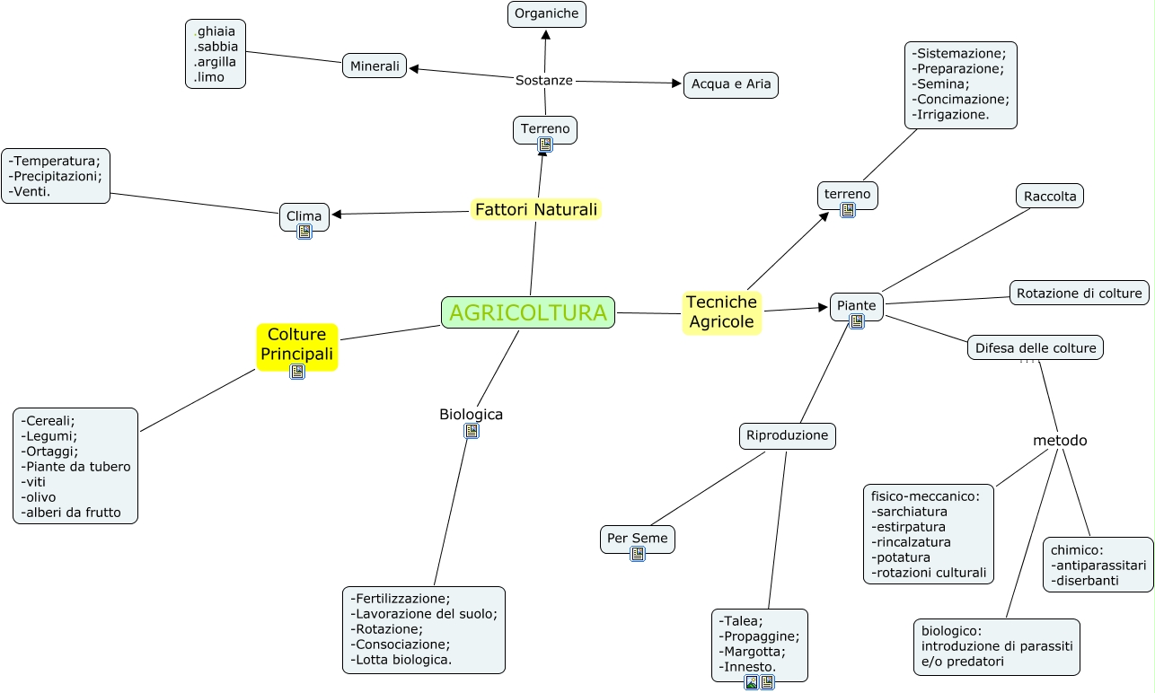 Questa Cmap, creata con IHMC CmapTools, contiene informazioni relative a: AGRICOLTURA, Difesa delle colture metodo chimico: -antiparassitari -diserbanti, AGRICOLTURA Colture Principali -Cereali; -Legumi; -Ortaggi; -Piante da tubero -viti -olivo -alberi da frutto, AGRICOLTURA Fattori Naturali Terreno, AGRICOLTURA Tecniche Agricole Piante, Riproduzione ???? Per Seme, Clima ???? -Temperatura; -Precipitazioni; -Venti., Terreno Sostanze Acqua e Aria, Piante ???? Rotazione di colture, terreno ???? -Sistemazione; -Preparazione; -Semina; -Concimazione; -Irrigazione., AGRICOLTURA Fattori Naturali Clima, Terreno Sostanze Minerali, Difesa delle colture metodo fisico-meccanico: -sarchiatura -estirpatura -rincalzatura -potatura -rotazioni culturali, Piante ???? Riproduzione, Piante ???? Raccolta, Riproduzione ???? -Talea; -Propaggine; -Margotta; -Innesto., Minerali ???? .ghiaia .sabbia .argilla .limo, Terreno Sostanze Organiche, AGRICOLTURA Tecniche Agricole terreno, AGRICOLTURA Biologica -Fertilizzazione; -Lavorazione del suolo; -Rotazione; -Consociazione; -Lotta biologica., Difesa delle colture metodo biologico: introduzione di parassiti e/o predatori