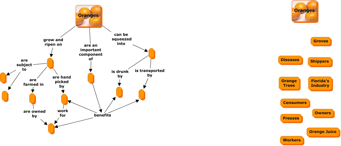 This Concept Map, created with IHMC CmapTools, has information related to: oranges, is transported by, benefits, benefits, is drunk by, Oranges are an important component of, are farmed in, work for, benefits, are owned by, are subject to, are hand picked by, Oranges grow and ripen on, Oranges can be squeezed into, are subject to, benefits