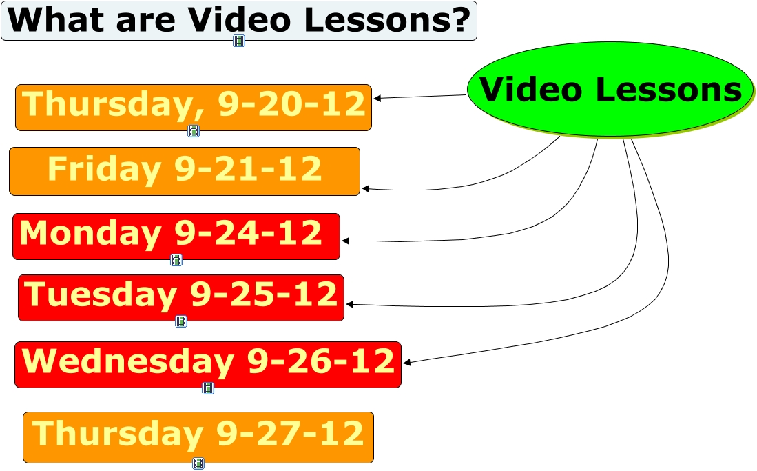 This Concept Map, created with IHMC CmapTools, has information related to: LESSONS BY DATE, Video Lessons Monday 9-24-12, Video Lessons Tuesday 9-25-12, Video Lessons Thursday, 9-20-12, Video Lessons Friday 9-21-12, Video Lessons Wednesday 9-26-12