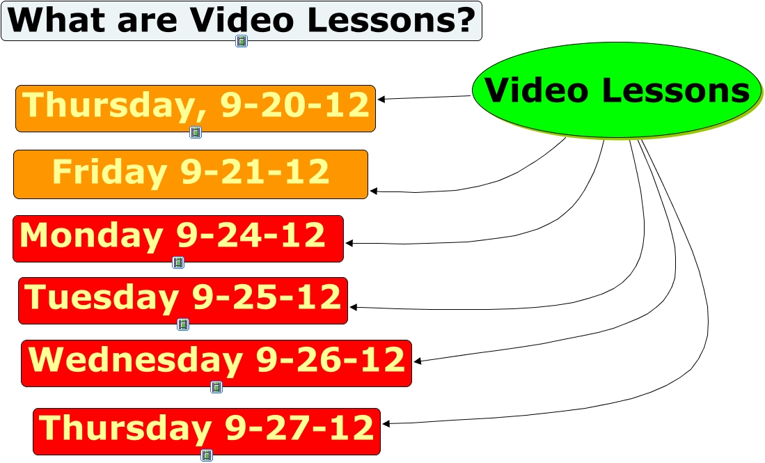 This Concept Map, created with IHMC CmapTools, has information related to: LESSONS BY DATE, Video Lessons Thursday 9-27-12, Video Lessons Monday 9-24-12, Video Lessons Tuesday 9-25-12, Video Lessons Thursday, 9-20-12, Video Lessons Friday 9-21-12, Video Lessons Wednesday 9-26-12