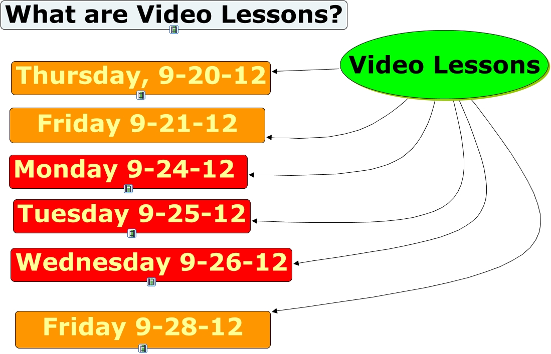 This Concept Map, created with IHMC CmapTools, has information related to: LESSONS BY DATE, Video Lessons Monday 9-24-12, Video Lessons Friday 9-28-12, Video Lessons Tuesday 9-25-12, Video Lessons Thursday, 9-20-12, Video Lessons Friday 9-21-12, Video Lessons Wednesday 9-26-12