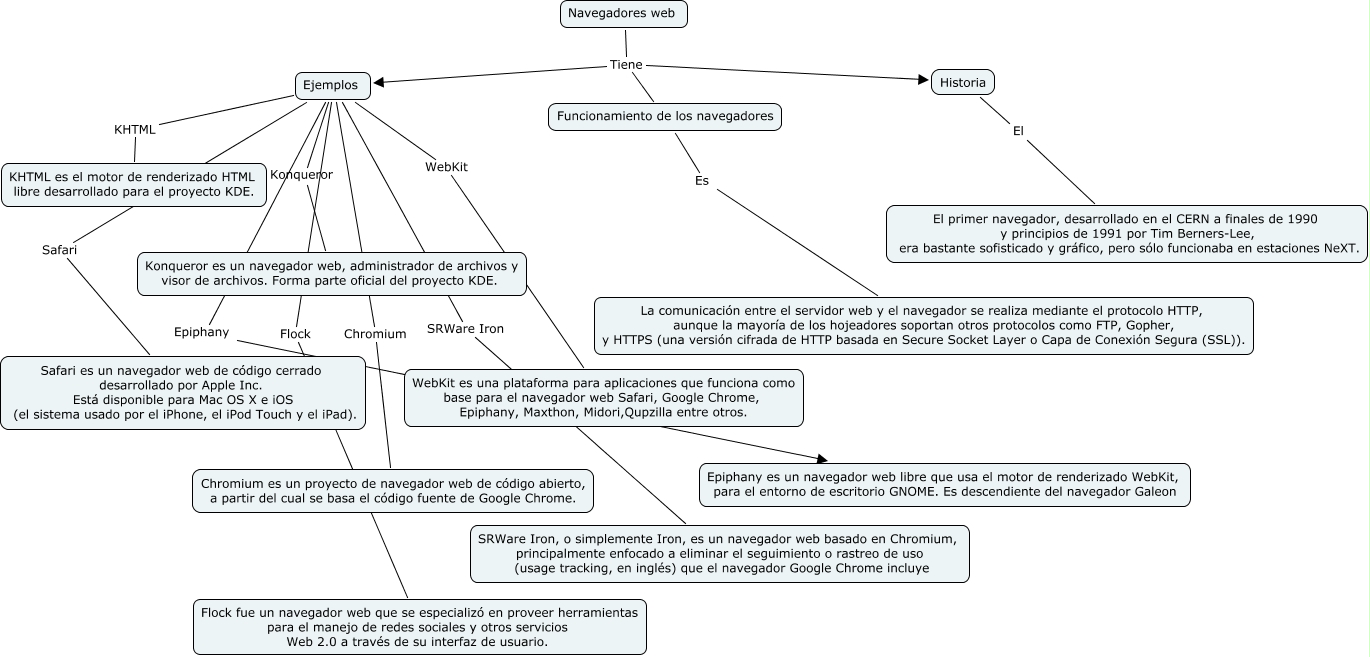 Este Cmap, tiene información relacionada con: SALA_1_PC16_navegadores, Ejemplos Chromium Chromium es un proyecto de navegador web de código abierto, a partir del cual se basa el código fuente de Google Chrome., Historia El El primer navegador, desarrollado en el CERN a finales de 1990 y principios de 1991 por Tim Berners-Lee, era bastante sofisticado y gráfico, pero sólo funcionaba en estaciones NeXT., Navegadores web Tiene Historia, Ejemplos Safari Safari es un navegador web de código cerrado desarrollado por Apple Inc. Está disponible para Mac OS X e iOS (el sistema usado por el iPhone, el iPod Touch y el iPad)., Ejemplos SRWare Iron SRWare Iron, o simplemente Iron, es un navegador web basado en Chromium, principalmente enfocado a eliminar el seguimiento o rastreo de uso (usage tracking, en inglés) que el navegador Google Chrome incluye, Ejemplos WebKit WebKit es una plataforma para aplicaciones que funciona como base para el navegador web Safari, Google Chrome, Epiphany, Maxthon, Midori,Qupzilla entre otros., Ejemplos Epiphany Epiphany es un navegador web libre que usa el motor de renderizado WebKit, para el entorno de escritorio GNOME. Es descendiente del navegador Galeon, Ejemplos Konqueror Konqueror es un navegador web, administrador de archivos y visor de archivos. Forma parte oficial del proyecto KDE., Navegadores web Tiene Ejemplos, Ejemplos KHTML KHTML es el motor de renderizado HTML libre desarrollado para el proyecto KDE., Navegadores web Tiene Funcionamiento de los navegadores, Ejemplos Flock Flock fue un navegador web que se especializó en proveer herramientas para el manejo de redes sociales y otros servicios Web 2.0 a través de su interfaz de usuario., Funcionamiento de los navegadores Es La comunicación entre el servidor web y el navegador se realiza mediante el protocolo HTTP, aunque la mayoría de los hojeadores soportan otros protocolos como FTP, Gopher, y HTTPS (una versión cifrada de HTTP basada en Secure Socket Layer o Capa de Conexión Segura (SSL)).