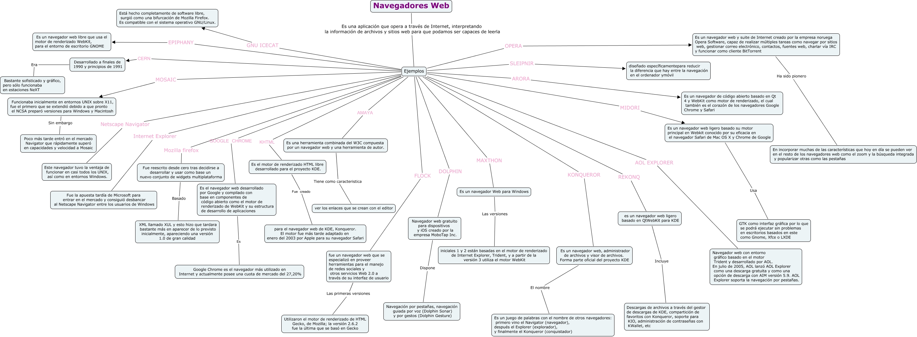 Este Cmap, tiene información relacionada con: SALA_1_PC3_NAVEGADORES, Navegadores Web Es una aplicación que opera a través de Internet, interpretando la información de archivos y sitios web para que podamos ser capaces de leerla Ejemplos, Es un navegador web, administrador de archivos y visor de archivos. Forma parte oficial del proyecto KDE El nombre Es un juego de palabras con el nombre de otros navegadores: primero vino el Navigator (navegador), después el Explorer (explorador), y finalmente el Konqueror (conquistador), Ejemplos KONQUEROR Es un navegador web, administrador de archivos y visor de archivos. Forma parte oficial del proyecto KDE, Ejemplos CERN Desarrollado a finales de 1990 y principios de 1991, es un navegador web ligero basado en QtWebKit para KDE Incluye Descargas de archivos a través del gestor de descargas de KDE, compartición de favoritos con Konqueror, soporte para KIO, administración de contraseñas con KWallet, etc, Es el motor de renderizado HTML libre desarrollado para el proyecto KDE. Fue creado para el navegador web de KDE, Konqueror. El motor fue más tarde adaptado en enero del 2003 por Apple para su navegador Safari, Fue reescrito desde cero tras decidirse a desarrollar y usar como base un nuevo conjunto de widgets multiplataforma Basado XML llamado XUL y esto hizo que tardara bastante más en aparecer de lo previsto inicialmente, apareciendo una versión 1.0 de gran calidad, Ejemplos MOSAIC Funcionaba inicialmente en entornos UNIX sobre X11, fue el primero que se extendió debido a que pronto el NCSA preparó versiones para Windows y Macintosh, Ejemplos Netscape Navigator Este navegador tuvo la ventaja de funcionar en casi todos los UNIX, así como en entornos Windows., Ejemplos GOOGLE CHROME Es el navegador web desarrollado por Google y compilado con base en componentes de código abierto como el motor de renderizado de WebKit y su estructura de desarrollo de aplicaciones, Ejemplos AMAYA Es una herramienta combinada del W3C compuesta por un navegador web y una herramienta de autor., Es un navegador Web para Windows Las versiones iniciales 1 y 2 están basadas en el motor de renderizado de Internet Explorer, Trident, y a partir de la versión 3 utiliza el motor WebKit, Ejemplos ARORA Es un navegador de código abierto basado en Qt 4 y WebKit como motor de renderizado, el cual también es el corazón de los navegadores Google Chrome y Safari, Ejemplos KHTML Es el motor de renderizado HTML libre desarrollado para el proyecto KDE., Ejemplos SLEIPNIR diseñado específicamentepara reducir la diferencia que hay entre la navegación en el ordenador ymóvil, Ejemplos MAXTHON Es un navegador Web para Windows, Desarrollado a finales de 1990 y principios de 1991 Era Bastante sofisticado y gráfico, pero sólo funcionaba en estaciones NeXT, fue un navegador web que se especializó en proveer herramientas para el manejo de redes sociales y otros servicios Web 2.0 a través de su interfaz de usuario Las primeras versiones Utilizaron el motor de renderizado de HTML Gecko, de Mozilla; la versión 2.6.2 fue la última que se basó en Gecko, Ejemplos REKONQ es un navegador web ligero basado en QtWebKit para KDE, Ejemplos FLOCK fue un navegador web que se especializó en proveer herramientas para el manejo de redes sociales y otros servicios Web 2.0 a través de su interfaz de usuario