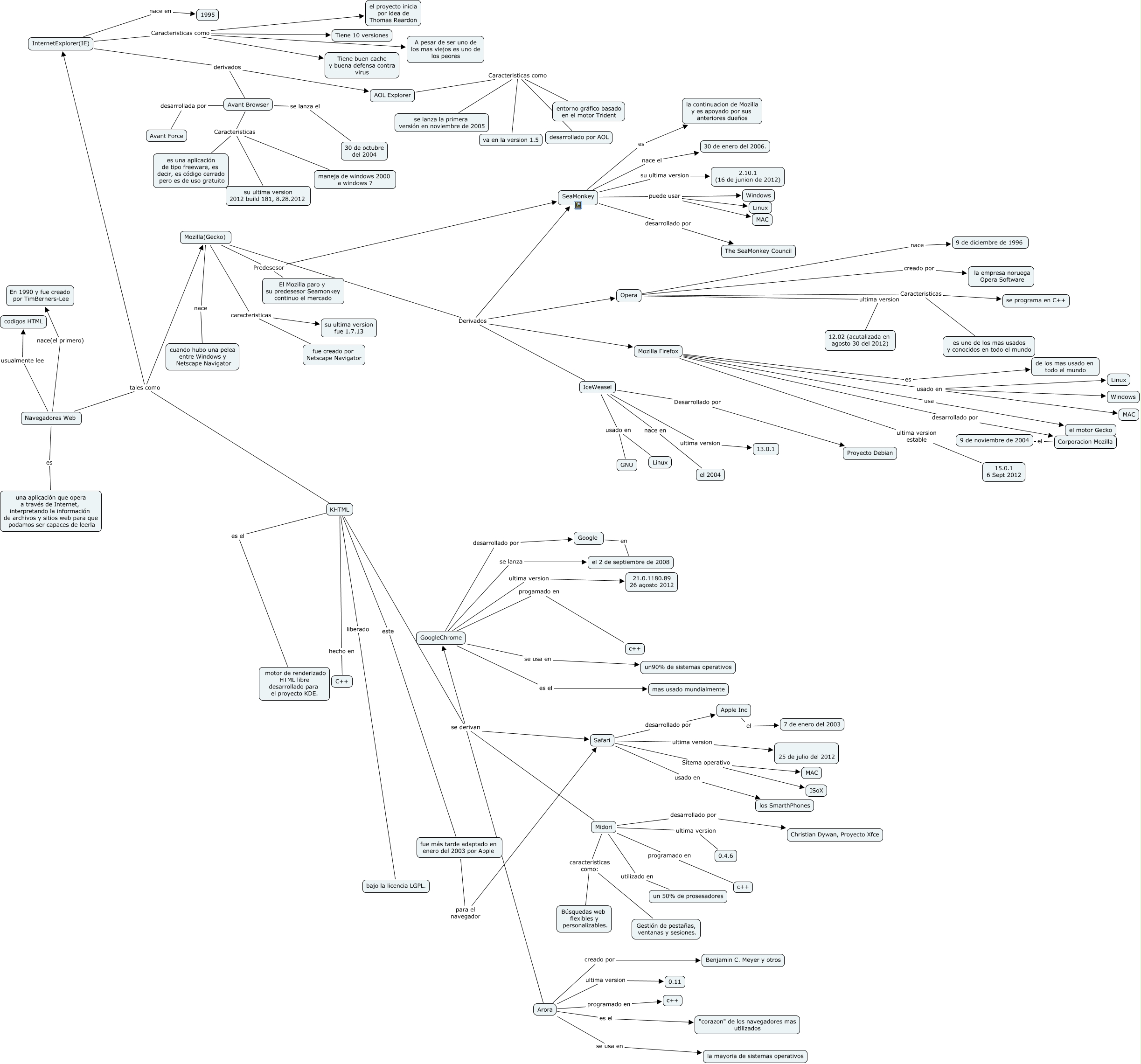 Este Cmap, tiene información relacionada con: SALA_1_PC1_NavegadoresWeb, Mozilla(Gecko) Predesesor El Mozilla paro y su predesesor Seamonkey continuo el mercado, Arora se usa en la mayoria de sistemas operativos, AOL Explorer Caracteristicas como se lanza la primera versión en noviembre de 2005, AOL Explorer Caracteristicas como desarrollado por AOL, Safari ultima version 25 de julio del 2012, KHTML se derivan Safari, Midori ultima version 0.4.6, SeaMonkey puede usar Windows, AOL Explorer Caracteristicas como va en la version 1.5, Mozilla(Gecko) Predesesor SeaMonkey, KHTML este fue más tarde adaptado en enero del 2003 por Apple, IceWeasel usado en Linux, SeaMonkey desarrollado por The SeaMonkey Council, Mozilla(Gecko) Derivados Opera, Mozilla(Gecko) Derivados Mozilla Firefox, KHTML se derivan Arora, Safari Sitema operativo ISoX, Navegadores Web tales como InternetExplorer(IE), fue más tarde adaptado en enero del 2003 por Apple para el navegador Safari, Avant Browser se lanza el 30 de octubre del 2004