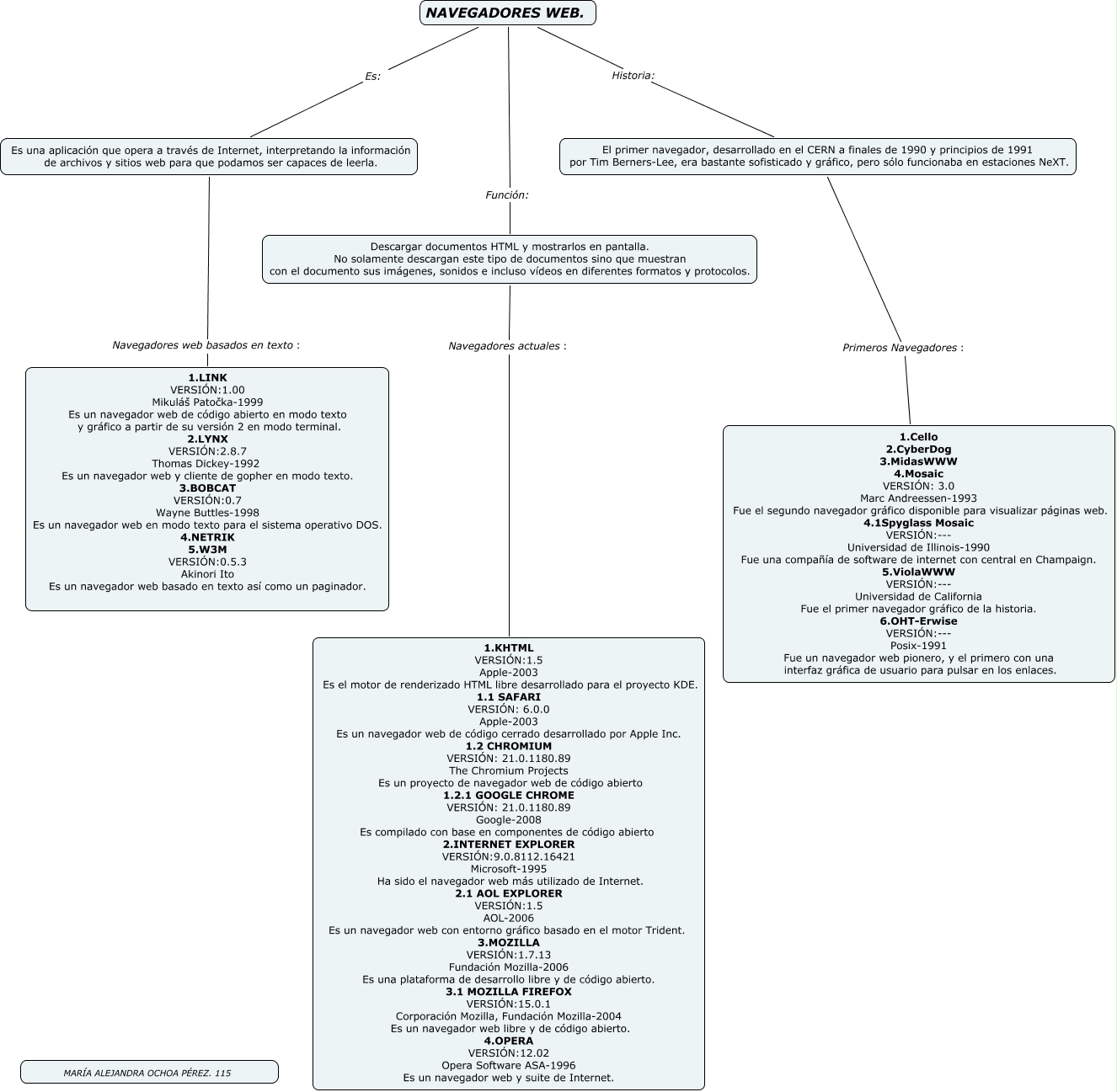 Este Cmap, tiene información relacionada con: SALA_1_PC9_Navegadores Web, NAVEGADORES WEB. Es: Es una aplicación que opera a través de Internet, interpretando la información de archivos y sitios web para que podamos ser capaces de leerla., NAVEGADORES WEB. Función: Descargar documentos HTML y mostrarlos en pantalla. No solamente descargan este tipo de documentos sino que muestran con el documento sus imágenes, sonidos e incluso vídeos en diferentes formatos y protocolos., Es una aplicación que opera a través de Internet, interpretando la información de archivos y sitios web para que podamos ser capaces de leerla. Navegadores web basados en texto: 1.LINK VERSIÓN:1.00 Mikuláš Patočka-1999 Es un navegador web de código abierto en modo texto y gráfico a partir de su versión 2 en modo terminal. 2.LYNX VERSIÓN:2.8.7 Thomas Dickey-1992 Es un navegador web y cliente de gopher en modo texto. 3.BOBCAT VERSIÓN:0.7 Wayne Buttles-1998 Es un navegador web en modo texto para el sistema operativo DOS. 4.NETRIK 5.W3M VERSIÓN:0.5.3 Akinori Ito Es un navegador web basado en texto así como un paginador., Descargar documentos HTML y mostrarlos en pantalla. No solamente descargan este tipo de documentos sino que muestran con el documento sus imágenes, sonidos e incluso vídeos en diferentes formatos y protocolos. Navegadores actuales: 1.KHTML VERSIÓN:1.5 Apple-2003 Es el motor de renderizado HTML libre desarrollado para el proyecto KDE. 1.1 SAFARI VERSIÓN: 6.0.0 Apple-2003 Es un navegador web de código cerrado desarrollado por Apple Inc. 1.2 CHROMIUM VERSIÓN: 21.0.1180.89 The Chromium Projects Es un proyecto de navegador web de código abierto 1.2.1 GOOGLE CHROME VERSIÓN: 21.0.1180.89 Google-2008 Es compilado con base en componentes de código abierto 2.INTERNET EXPLORER VERSIÓN:9.0.8112.16421 Microsoft-1995 Ha sido el navegador web más utilizado de Internet. 2.1 AOL EXPLORER VERSIÓN:1.5 AOL-2006 Es un navegador web con entorno gráfico basado en el motor Trident. 3.MOZILLA VERSIÓN:1.7.13 Fundación Mozilla-2006 Es una plataforma de desarrollo libre y de código abierto. 3.1 MOZILLA FIREFOX VERSIÓN:15.0.1 Corporación Mozilla, Fundación Mozilla-2004 Es un navegador web libre y de código abierto. 4.OPERA VERSIÓN:12.02 Opera Software ASA-1996 Es un navegador web y suite de Internet., NAVEGADORES WEB. Historia: El primer navegador, desarrollado en el CERN a finales de 1990 y principios de 1991 por Tim Berners-Lee, era bastante sofisticado y gráfico, pero sólo funcionaba en estaciones NeXT., El primer navegador, desarrollado en el CERN a finales de 1990 y principios de 1991 por Tim Berners-Lee, era bastante sofisticado y gráfico, pero sólo funcionaba en estaciones NeXT. Primeros Navegadores: 1.Cello 2.CyberDog 3.MidasWWW 4.Mosaic VERSIÓN: 3.0 Marc Andreessen-1993 Fue el segundo navegador gráfico disponible para visualizar páginas web. 4.1Spyglass Mosaic VERSIÓN:--- Universidad de Illinois-1990 Fue una compañía de software de internet con central en Champaign. 5.ViolaWWW VERSIÓN:--- Universidad de California Fue el primer navegador gráfico de la historia. 6.OHT-Erwise VERSIÓN:--- Posix-1991 Fue un navegador web pionero, y el primero con una interfaz gráfica de usuario para pulsar en los enlaces.