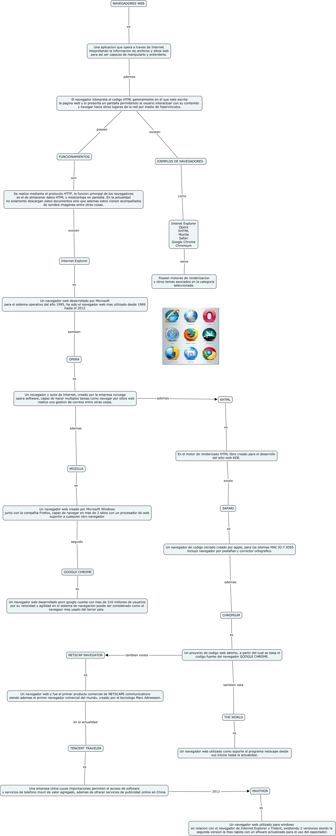 Este Cmap, tiene información relacionada con: SALA_1_PC4_Juan Sebastian Bonilla Segura 113, Intenet Explorer Opera KHTML Mozilla Safari Google Chrome Chromium estos Poseen motores de renderizacion y otros temas asociados en la categoria seleccionada., Una empresa china cuyas importaciones permiten el acceso de software y servicios de telefono movil de valor agregado, ademas de ofrecer servicios de publicidad online en China. 2012 MAXTHON, THE WORLD es Un navegador web utilizado como soporte al programa netscape desde sus inicios hasta la actualidad., Un navegador y suite de Internet, creado por la empresa noruega opera software, capaz de hacer multiples tareas como navegar por sitios web realiza una gestion de correos entre otras cosas. ademas KHTML, Un navegador web desarrollado por Microsoft para el sistema operativo del año 1995, ha sido el navegador web mas utilizado desde 1999 hasta el 2012 tambien OPERA, SAFARI es Un navegador de codigo cerrado creado por apple, para los sitemas MAC IO Y IOS5 incluye navegador por pestañas y corrector ortografico., KHTML es Es el motor de renderizado HTML libre creado para el desarrollo del sitio web KDE., TENCENT TRAVELER es Una empresa china cuyas importaciones permiten el acceso de software y servicios de telefono movil de valor agregado, ademas de ofrecer servicios de publicidad online en China., Un proyecto de codigo web abierto, a partir del cual se basa el codigo fuente del navegador GOOGLE CHROME. tambien esta THE WORLD, Un navegador web creado por Microsoft Windows junto con la compañia Firefox, capaz de navegar en mas de 2 sitios con un procesador de web superior a cualquier otro navegador seguido GOOGLE CHROME, Un navegador web y fue el primer producto comercial de NETSCAPE communications siendo ademas el primer navegador comercial del mundo, creado por el tecnologo Marc Adreessen. en la actualidad TENCENT TRAVELER, NETSCAP NAVEGATOR es Un navegador web y fue el primer producto comercial de NETSCAPE communications siendo ademas el primer navegador comercial del mundo, creado por el tecnologo Marc Adreessen., MOZILLA es Un navegador web creado por Microsoft Windows junto con la compañia Firefox, capaz de navegar en mas de 2 sitios con un procesador de web superior a cualquier otro navegador, MAXTHON es Un navegador web utilizado para windows en relacion con el navegador de Internet Explorer y Trident, existiendo 2 versiones siendo la segunda version la mas rapida con un sftware actualizado para el uso del espectador., GOOGLE CHROME es Un navegador web desarrollado porn google cuenta con mas de 310 millones de usuarios por su velocidad y agilidad en el sistema de navegacion puede ser considerado como el navegaor mas usado del tercer pais., El navegador interpreta el codigo HTML generalmente en el que este escrita la pagina web y lo presenta en pantalla permitiendo al usuario interactuar con su contenido y navegar hacia otros lugares de la red por medio de hipervinculos. existen EJEMPLOS DE NAVEGADORES, FUNCIONAMIENTOS son Se realiza mediante el protocolo HTTP, la funcion principal de los navegadores es el de almacenar datos HTML y mostrarlops en pantalla. En la actualidad no solamente descargan estos documentos sino que ademas estos vienen acompañados de sonidos imagenes entre otras cosas., NAVEGADORES WEB es Una aplicacion que opera a traves de Internet intepretando la informacion de archivos y sitios web para asi ser capaces de manipularlo y entenderlo., Internet Explorer es Un navegador web desarrollado por Microsoft para el sistema operativo del año 1995, ha sido el navegador web mas utilizado desde 1999 hasta el 2012, Se realiza mediante el protocolo HTTP, la funcion principal de los navegadores es el de almacenar datos HTML y mostrarlops en pantalla. En la actualidad no solamente descargan estos documentos sino que ademas estos vienen acompañados de sonidos imagenes entre otras cosas. existen Internet Explorer