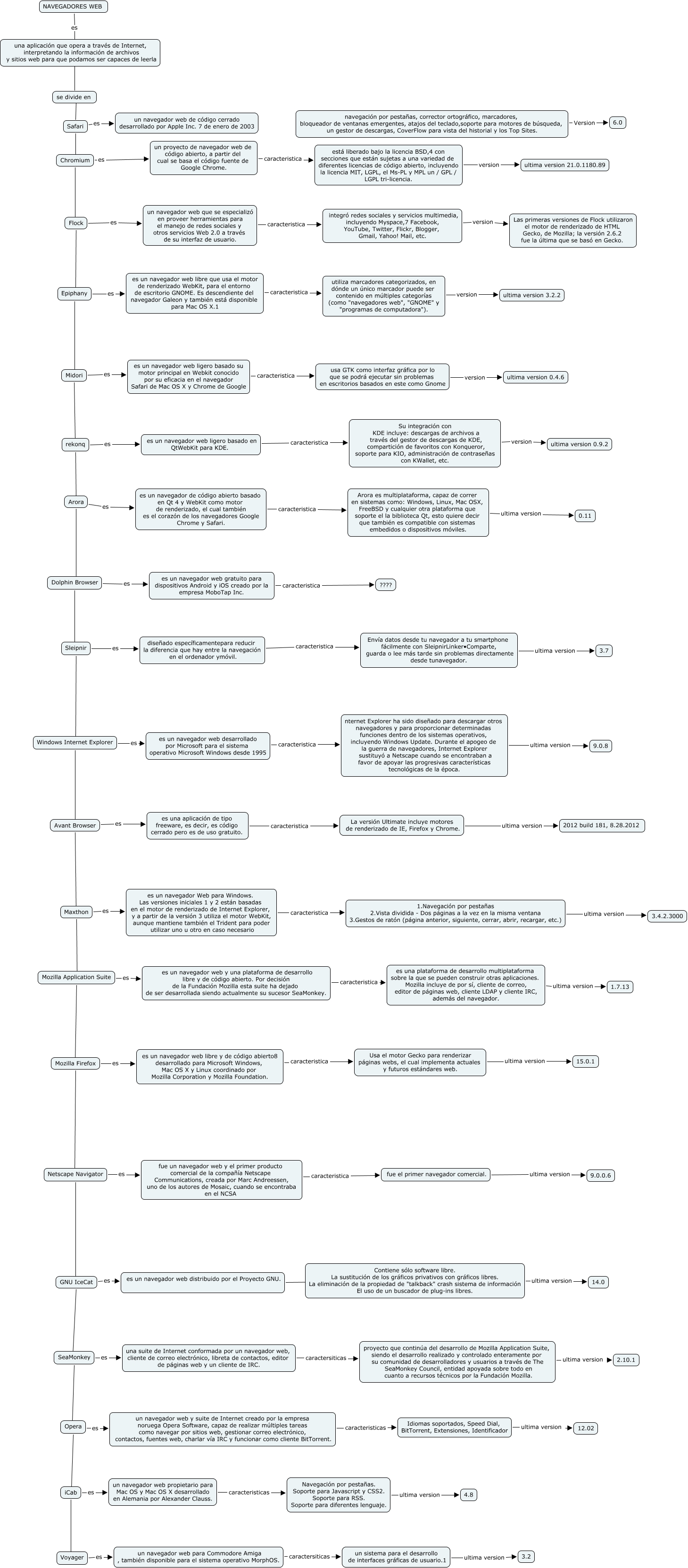 Este Cmap, tiene información relacionada con: SALA_1_PC12_Navegadores Web, Epiphany ???? Midori, Voyager es un navegador web para Commodore Amiga , también disponible para el sistema operativo MorphOS., un navegador web y suite de Internet creado por la empresa noruega Opera Software, capaz de realizar múltiples tareas como navegar por sitios web, gestionar correo electrónico, contactos, fuentes web, charlar vía IRC y funcionar como cliente BitTorrent. caracteristicas Idiomas soportados, Speed Dial, BitTorrent, Extensiones, Identificador, utiliza marcadores categorizados, en dónde un único marcador puede ser contenido en múltiples categorías (como "navegadores web", "GNOME" y "programas de computadora"). version ultima version 3.2.2, SeaMonkey ???? Opera, Opera es un navegador web y suite de Internet creado por la empresa noruega Opera Software, capaz de realizar múltiples tareas como navegar por sitios web, gestionar correo electrónico, contactos, fuentes web, charlar vía IRC y funcionar como cliente BitTorrent., NAVEGADORES WEB es se divide en, integró redes sociales y servicios multimedia, incluyendo Myspace,7 Facebook, YouTube, Twitter, Flickr, Blogger, Gmail, Yahoo! Mail, etc. version Las primeras versiones de Flock utilizaron el motor de renderizado de HTML Gecko, de Mozilla; la versión 2.6.2 fue la última que se basó en Gecko., Safari es un navegador web de código cerrado desarrollado por Apple Inc. 7 de enero de 2003, es un navegador web gratuito para dispositivos Android y iOS creado por la empresa MoboTap Inc. caracteristica ????, es un navegador web distribuido por el Proyecto GNU. caracteristica Contiene sólo software libre. La sustitución de los gráficos privativos con gráficos libres. La eliminación de la propiedad de "talkback" crash sistema de información El uso de un buscador de plug-ins libres., Epiphany es es un navegador web libre que usa el motor de renderizado WebKit, para el entorno de escritorio GNOME. Es descendiente del navegador Galeon y también está disponible para Mac OS X.1, Netscape Navigator es fue un navegador web y el primer producto comercial de la compañía Netscape Communications, creada por Marc Andreessen, uno de los autores de Mosaic, cuando se encontraba en el NCSA, Dolphin Browser es es un navegador web gratuito para dispositivos Android y iOS creado por la empresa MoboTap Inc., está liberado bajo la licencia BSD,4 con secciones que están sujetas a una variedad de diferentes licencias de código abierto, incluyendo la licencia MIT, LGPL, el Ms-PL y MPL un / GPL / LGPL tri-licencia. version ultima version 21.0.1180.89, Flock ???? Epiphany, usa GTK como interfaz gráfica por lo que se podrá ejecutar sin problemas en escritorios basados en este como Gnome version ultima version 0.4.6, Mozilla Firefox es es un navegador web libre y de código abierto8 desarrollado para Microsoft Windows, Mac OS X y Linux coordinado por Mozilla Corporation y Mozilla Foundation., Arora es multiplataforma, capaz de correr en sistemas como: Windows, Linux, Mac OSX, FreeBSD y cualquier otra plataforma que soporte el la biblioteca Qt, esto quiere decir que también es compatible con sistemas embedidos o dispositivos móviles. ultima version 0.11, se divide en ???? Safari