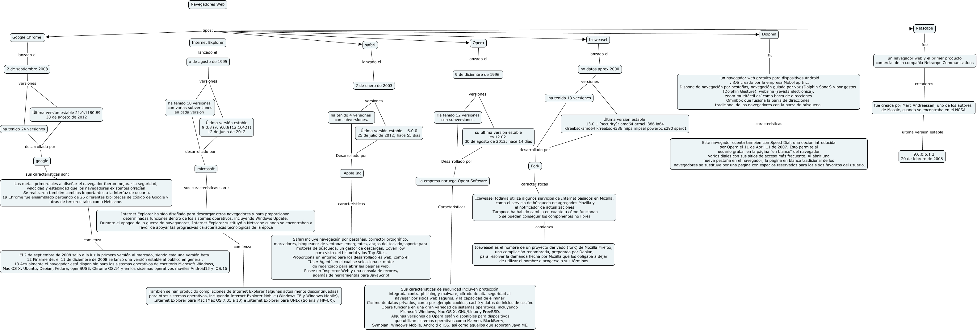 Este Cmap, tiene información relacionada con: SALA_1_PC8_navegadores, 9 de diciembre de 1996 versiones Ha tenido 12 versiones con subversiones., Navegadores Web tipos: Dolphin, Navegadores Web tipos: Netscape, Ha tenido 12 versiones con subversiones. Desarrollado por la empresa noruega Opera Software, Iceweasel todavía utiliza algunos servicios de Internet basados en Mozilla, como el servicio de búsqueda de agregados Mozilla y el notificador de actualizaciones. Tampoco ha habido cambio en cuanto a cómo funcionan o se pueden conseguir los componentes no libres. comienza Iceweasel es el nombre de un proyecto derivado (fork) de Mozilla Firefox, una compilación renombrada, preparada por Debian, para resolver la demanda hecha por Mozilla que los obligaba a dejar de utilizar el nombre o acogerse a sus términos, ha tenido 13 versiones desarrollado por Fork, Fork caracteristicas Iceweasel todavía utiliza algunos servicios de Internet basados en Mozilla, como el servicio de búsqueda de agregados Mozilla y el notificador de actualizaciones. Tampoco ha habido cambio en cuanto a cómo funcionan o se pueden conseguir los componentes no libres., Internet Explorer lanzado el x de agosto de 1995, la empresa noruega Opera Software Caracteristicas Sus características de seguridad incluyen protección integrada contra phishing y malware, cifrado de alta seguridad al navegar por sitios web seguros, y la capacidad de eliminar fácilmente datos privados, como por ejemplo cookies, caché y datos de inicios de sesión. Opera funciona en una gran variedad de sistemas operativos, incluyendo Microsoft Windows, Mac OS X, GNU/Linux y FreeBSD. Algunas versiones de Opera están disponibles para dispositivos que utilizan sistemas operativos como Maemo, BlackBerry, Symbian, Windows Mobile, Android o iOS, así como aquellos que soportan Java ME., ha tenido 4 versiones con subversiones. Desarrollado por Apple Inc, ha tenido 10 versiones con varias subversiones en cada version desarrollado por microsoft, Última versión estable 6.0.0 25 de julio de 2012; hace 55 días Desarrollado por Apple Inc, Iceweasel lanzado el no datos aprox 2000, ha tenido 24 versiones desarrollado por google, x de agosto de 1995 versiones Última versión estable 9.0.8 (v. 9.0.8112.16421) 12 de junio de 2012, Internet Explorer ha sido diseñado para descargar otros navegadores y para proporcionar determinadas funciones dentro de los sistemas operativos, incluyendo Windows Update. Durante el apogeo de la guerra de navegadores, Internet Explorer sustituyó a Netscape cuando se encontraban a favor de apoyar las progresivas características tecnológicas de la época comienza También se han producido compilaciones de Internet Explorer (algunas actualmente descontinuadas) para otros sistemas operativos, incluyendo Internet Explorer Mobile (Windows CE y Windows Mobile), Internet Explorer para Mac (Mac OS 7.01 a 10) e Internet Explorer para UNIX (Solaris y HP-UX)., Navegadores Web tipos: Iceweasel, Última versión estable 13.0.1 [security]: amd64 armel i386 ia64 kfreebsd-amd64 kfreebsd-i386 mips mipsel powerpc s390 sparc1 desarrollado por Fork, 2 de septiembre 2008 versiones Última versión estable 21.0.1180.89 30 de agosto de 2012, Navegadores Web tipos: Opera