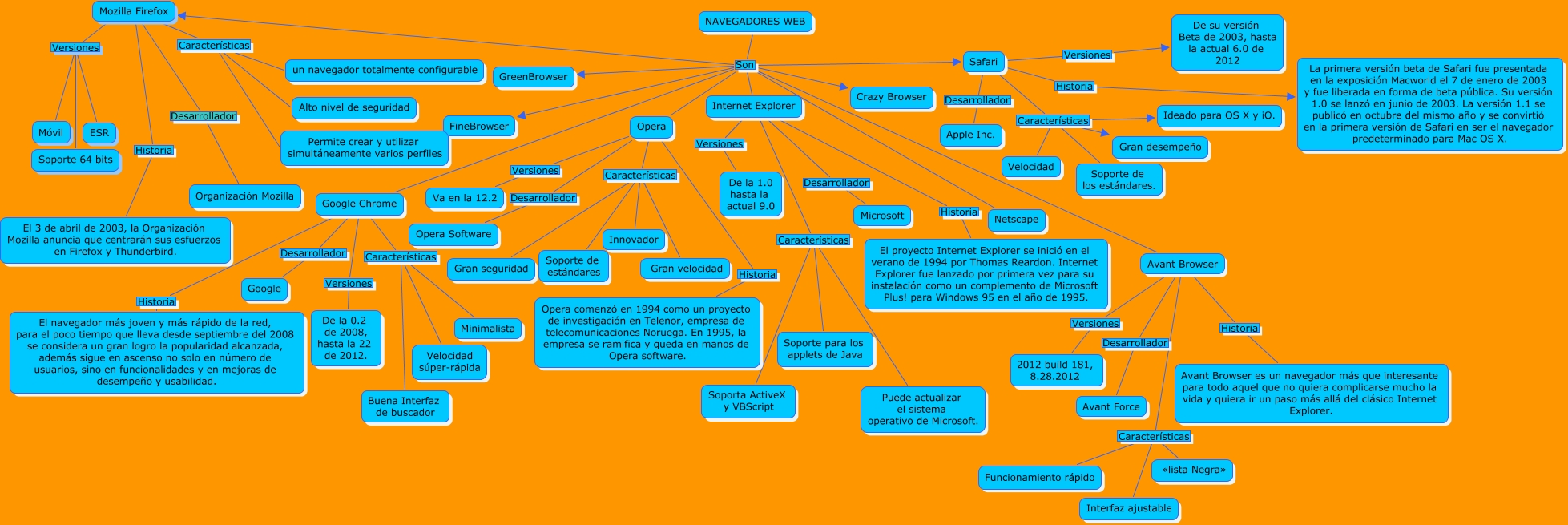 Este Cmap, tiene información relacionada con: Javier Montenegro Cortés, Opera Historia Opera comenzó en 1994 como un proyecto de investigación en Telenor, empresa de telecomunicaciones Noruega. En 1995, la empresa se ramifica y queda en manos de Opera software., NAVEGADORES WEB Son Google Chrome, Safari Características Gran desempeño, Mozilla Firefox Historia El 3 de abril de 2003, la Organización Mozilla anuncia que centrarán sus esfuerzos en Firefox y Thunderbird., Internet Explorer Historia El proyecto Internet Explorer se inició en el verano de 1994 por Thomas Reardon. Internet Explorer fue lanzado por primera vez para su instalación como un complemento de Microsoft Plus! para Windows 95 en el año de 1995., Avant Browser Características Funcionamiento rápido, Mozilla Firefox Desarrollador Organización Mozilla, NAVEGADORES WEB Son GreenBrowser, Avant Browser Características «lista Negra», Opera Desarrollador Opera Software, NAVEGADORES WEB Son Safari, Internet Explorer Características Puede actualizar el sistema operativo de Microsoft., Mozilla Firefox Versiones ESR, NAVEGADORES WEB Son Mozilla Firefox, Google Chrome Características Velocidad súper-rápida, Safari Características Ideado para OS X y iO., NAVEGADORES WEB Son Opera, Opera Características Gran seguridad, Internet Explorer Características Soporta ActiveX y VBScript, Google Chrome Historia El navegador más joven y más rápido de la red, para el poco tiempo que lleva desde septiembre del 2008 se considera un gran logro la popularidad alcanzada, además sigue en ascenso no solo en número de usuarios, sino en funcionalidades y en mejoras de desempeño y usabilidad.