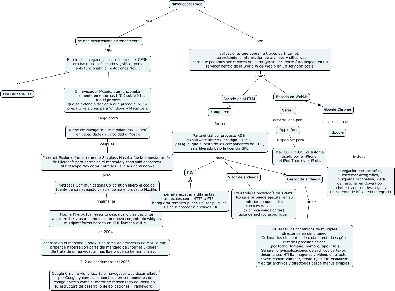 Este Cmap, tiene información relacionada con: Sin Título 3, Gestor de archivos permite Visualizar los contenidos de múltiples directorios en simultáneo. Ordenar los elementos de cada directorio según criterios preestablecidos (por fecha, tamaño, nombre, tipo, etc.). Generar previsualizaciones de archivos de texto, documentos HTML, imágenes y vídeos en el acto. Mover, copiar, eliminar, crear, ejecutar, visualizar y editar archivos y directorios desde menús simples., se han desarrollado historicamente 1990 El primer navegador, desarrollado en el CERN era bastante sofisticado y gráfico, pero sólo funcionaba en estaciones NeXT., Konqueror forma Parte oficial del proyecto KDE. Es software libre y de código abierto, y al igual que el resto de los componentes de KDE, está liberado bajo la licencia GPL., Basado en Webkit ???? Google Chrome, Google Chrome desarrollado por Google, El primer navegador, desarrollado en el CERN era bastante sofisticado y gráfico, pero sólo funcionaba en estaciones NeXT. Por Tim Berners-Lee, Parte oficial del proyecto KDE. Es software libre y de código abierto, y al igual que el resto de los componentes de KDE, está liberado bajo la licencia GPL. tiene Visor de archivos, aplicaciónes que operan a través de Internet, interpretando la información de archivos y sitios web para que podamos ser capaces de leerla (ya se encuentre ésta alojada en un servidor dentro de la World Wide Web o en un servidor local). Como Basado en Webkit, El navegador Mosaic, que funcionaba inicialmente en entornos UNIX sobre X11, fue el primero que se extendió debido a que pronto el NCSA preparó versiones para Windows y Macintosh. luego entró Netscape Navigator que rápidamente superó en capacidades y velocidad a Mosaic, Navegadores web Son aplicaciónes que operan a través de Internet, interpretando la información de archivos y sitios web para que podamos ser capaces de leerla (ya se encuentre ésta alojada en un servidor dentro de la World Wide Web o en un servidor local)., Netscape Communications Corporation liberó el código fuente de su navegador, naciendo así el proyecto Mozilla. finalmente Mozilla Firefox fue reescrito desde cero tras decidirse a desarrollar y usar como base un nuevo conjunto de widgets multiplataforma basado en XML llamado XUL y, Visor de archivos ???? Utilizando la tecnología de KParts, Konqueror puede ejecutar en su interior componentes capaces de visualizar (y en ocasiones editar) tipos de archivo específicos., Navegadores web que se han desarrollado historicamente, aplicaciónes que operan a través de Internet, interpretando la información de archivos y sitios web para que podamos ser capaces de leerla (ya se encuentre ésta alojada en un servidor dentro de la World Wide Web o en un servidor local). Como Basado en KHTLM, Mac OS X e iOS (el sistema usado por el iPhone, el iPod Touch y el iPad). incluye navegación por pestañas, corrector ortográfico, búsqueda progresiva, vista del historial en CoverFlow, administrador de descargas y un sistema de búsqueda integrado., Safari desarrollado por Apple Inc., Basado en Webkit ???? Safari, aparece en el mercado Firefox, una rama de desarrollo de Mozilla que pretende hacerse con parte del mercado de Internet Explorer. Se trata de un navegador más ligero que su hermano mayor. El 2 de septiembre del 2008 Google Chrome vio la luz. Es el navegador web desarrollado por Google y compilado con base en componentes de código abierto como el motor de renderizado de WebKit y su estructura de desarrollo de aplicaciones (Framework)., El primer navegador, desarrollado en el CERN era bastante sofisticado y gráfico, pero sólo funcionaba en estaciones NeXT. ???? El navegador Mosaic, que funcionaba inicialmente en entornos UNIX sobre X11, fue el primero que se extendió debido a que pronto el NCSA preparó versiones para Windows y Macintosh., Apple Inc. disponible para Mac OS X e iOS (el sistema usado por el iPhone, el iPod Touch y el iPad).
