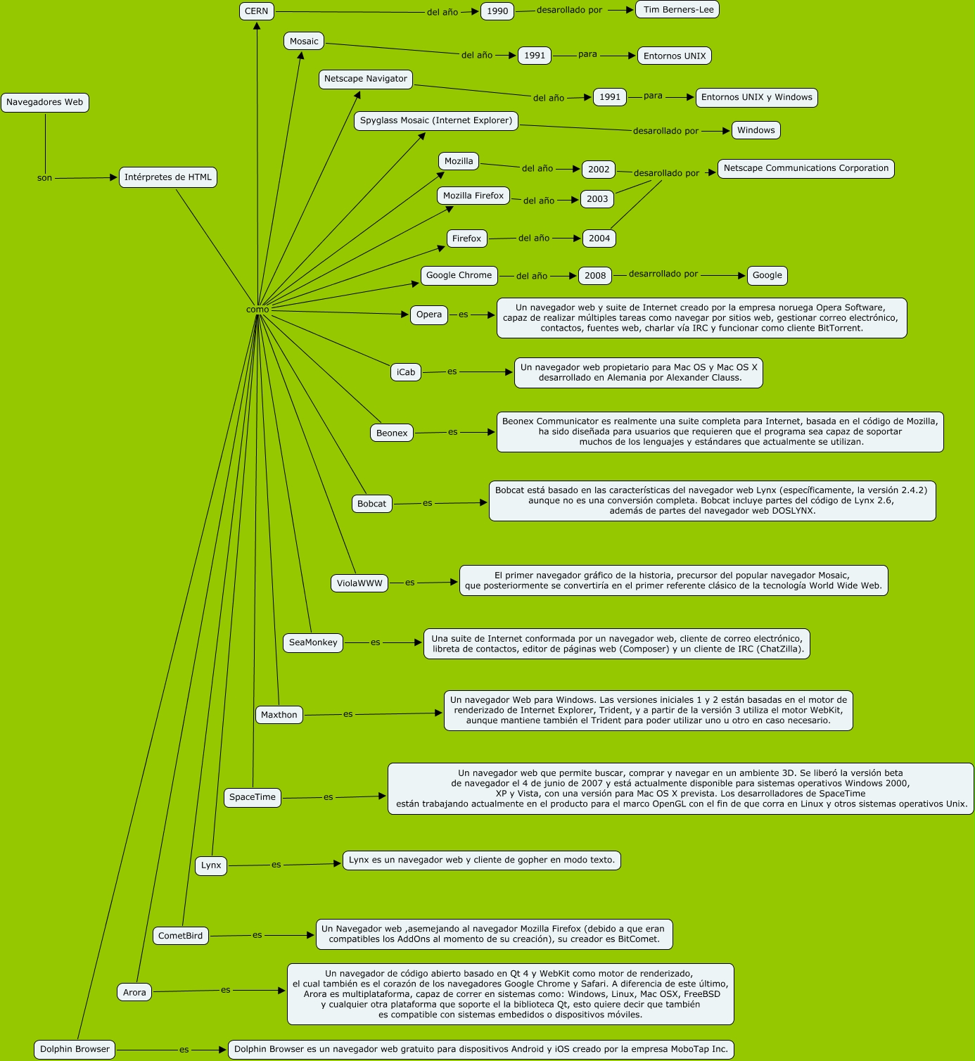 Este Cmap, tiene información relacionada con: SALA_1_PC7_navegadores web, 1991 para Entornos UNIX, Intérpretes de HTML como Firefox, Navegadores Web son Intérpretes de HTML, Intérpretes de HTML como SeaMonkey, Intérpretes de HTML como Spyglass Mosaic (Internet Explorer), Intérpretes de HTML como Dolphin Browser, Intérpretes de HTML como Google Chrome, Intérpretes de HTML como iCab, Intérpretes de HTML como Opera, Dolphin Browser es Dolphin Browser es un navegador web gratuito para dispositivos Android y iOS creado por la empresa MoboTap Inc., Intérpretes de HTML como Mozilla, 2004 desarollado por Netscape Communications Corporation, Bobcat es Bobcat está basado en las características del navegador web Lynx (específicamente, la versión 2.4.2) aunque no es una conversión completa. Bobcat incluye partes del código de Lynx 2.6, además de partes del navegador web DOSLYNX., Intérpretes de HTML como CERN, Intérpretes de HTML como Bobcat, iCab es Un navegador web propietario para Mac OS y Mac OS X desarrollado en Alemania por Alexander Clauss., Beonex es Beonex Communicator es realmente una suite completa para Internet, basada en el código de Mozilla, ha sido diseñada para usuarios que requieren que el programa sea capaz de soportar muchos de los lenguajes y estándares que actualmente se utilizan., Mosaic del año 1991, 2002 desarollado por Netscape Communications Corporation, 1991 para Entornos UNIX y Windows