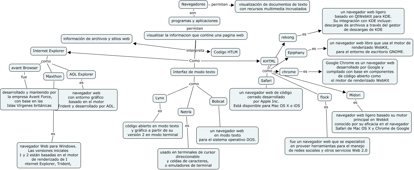 Este Cmap, tiene información relacionada con: SALA_1_PC10_navegadores web, KHTML como Midori, visualizar la informacion que contine una pagina web interpreta Codigo HTLM, visualizar la informacion que contine una pagina web Como Interfaz de modo texto, Lynx es código abierto en modo texto y gráfico a partir de su versión 2 en modo terminal, Midori es navegador web ligero basado su motor principal en Webkit conocido por su eficacia en el navegador Safari de Mac OS X y Chrome de Google, flock es fue un navegador web que se especializó en proveer herramientas para el manejo de redes sociales y otros servicios Web 2.0, Navegadores son programas y aplicaciones, AOL Explorer es navegador web con entorno gráfico basado en el motor Trident y desarrollado por AOL., Interfaz de modo texto como Bobcat, Internet Explorer como avant Browser, KHTML como rekong, Netrik es usado en terminales de cursor direccionable y celdas de caracteres, o emuladores de terminal, KHTML como Epiphany, avant Browser fue desarrollado y mantenido por la empresa Avant Force, con base en las Islas Vírgenes británicas, KHTML como flock, visualizar la informacion que contine una pagina web interpreta información de archivos y sitios web, chrome es Google Chrome es un navegador web desarrollado por Google y compilado con base en componentes de código abierto como el motor de renderizado WebKit, Interfaz de modo texto como Netrik, KHTML como Safari, Maxthon es navegador Web para Windows. Las versiones iniciales 1 y 2 están basadas en el motor de renderizado de I nternet Explorer, Trident,
