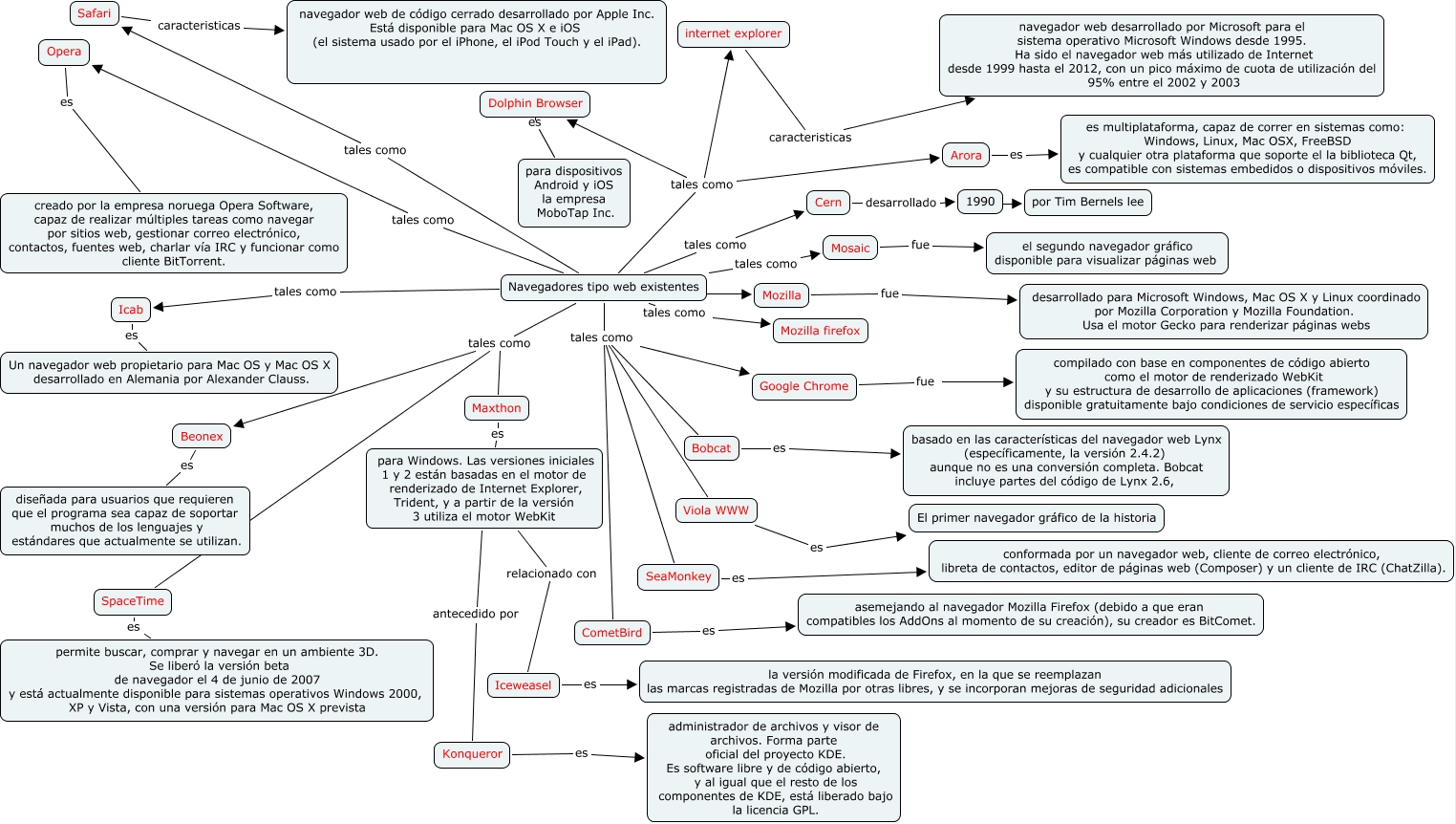 Este Cmap, tiene información relacionada con: SALA_1_PC7_navegadores web, Maxthon es para Windows. Las versiones iniciales 1 y 2 están basadas en el motor de renderizado de Internet Explorer, Trident, y a partir de la versión 3 utiliza el motor WebKit, Icab es Un navegador web propietario para Mac OS y Mac OS X desarrollado en Alemania por Alexander Clauss., Navegadores tipo web existentes tales como Icab, Viola WWW es El primer navegador gráfico de la historia, Navegadores tipo web existentes tales como CometBird, Navegadores tipo web existentes tales como Google Chrome, para Windows. Las versiones iniciales 1 y 2 están basadas en el motor de renderizado de Internet Explorer, Trident, y a partir de la versión 3 utiliza el motor WebKit relacionado con Iceweasel, Iceweasel es la versión modificada de Firefox, en la que se reemplazan las marcas registradas de Mozilla por otras libres, y se incorporan mejoras de seguridad adicionales, Navegadores tipo web existentes tales como Beonex, para Windows. Las versiones iniciales 1 y 2 están basadas en el motor de renderizado de Internet Explorer, Trident, y a partir de la versión 3 utiliza el motor WebKit antecedido por Konqueror, Navegadores tipo web existentes tales como Cern, Arora es es multiplataforma, capaz de correr en sistemas como: Windows, Linux, Mac OSX, FreeBSD y cualquier otra plataforma que soporte el la biblioteca Qt, es compatible con sistemas embedidos o dispositivos móviles., Navegadores tipo web existentes tales como Safari, Dolphin Browser es para dispositivos Android y iOS la empresa MoboTap Inc., Navegadores tipo web existentes tales como Bobcat, Beonex es diseñada para usuarios que requieren que el programa sea capaz de soportar muchos de los lenguajes y estándares que actualmente se utilizan., Navegadores tipo web existentes ???? Mozilla, Navegadores tipo web existentes tales como Viola WWW, Navegadores tipo web existentes tales como SeaMonkey, Navegadores tipo web existentes tales como Dolphin Browser