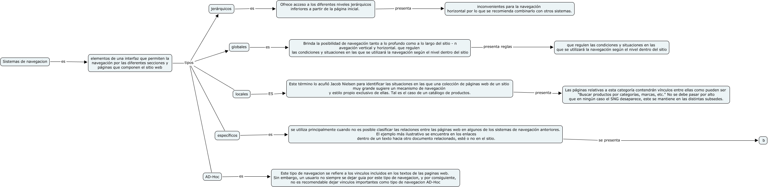 Este Cmap, tiene información relacionada con: SALA_1_PC6_SISTEMAS DE NAVEGACION, locales ES Este término lo acuñó Jacob Nielsen para identificar las situaciones en las que una colección de páginas web de un sitio muy grande sugiere un mecanismo de navegación y estilo propio exclusivo de ellas. Tal es el caso de un catálogo de productos., Sistemas de navegacion es elementos de una interfaz que permiten la navegación por las diferentes secciones y páginas que componen el sitio web, AD-Hoc es Este tipo de navegacion se refiere a los vinculos incluidos en los textos de las paginas web. Sin embargo, un usuario no siempre se dejar guia por este tipo de navegacion, y por consiguiente, no es recomendable dejar vinculos importantes como tipo de navegacion AD-Hoc, elementos de una interfaz que permiten la navegación por las diferentes secciones y páginas que componen el sitio web tipos específicos, elementos de una interfaz que permiten la navegación por las diferentes secciones y páginas que componen el sitio web tipos globales, se utiliza principalmente cuando no es posible clasificar las relaciones entre las páginas web en algunos de los sistemas de navegación anteriores. El ejemplo más ilustrativo se encuentra en los enlaces dentro de un texto hacia otro documento relacionado, esté o no en el sitio. se presenta b, elementos de una interfaz que permiten la navegación por las diferentes secciones y páginas que componen el sitio web tipos locales, elementos de una interfaz que permiten la navegación por las diferentes secciones y páginas que componen el sitio web tipos AD-Hoc, elementos de una interfaz que permiten la navegación por las diferentes secciones y páginas que componen el sitio web tipos jerárquicos, globales es Brinda la posibilidad de navegación tanto a lo profundo como a lo largo del sitio - n avegación vertical y horizontal. que regulen las condiciones y situaciones en las que se utilizará la navegación según el nivel dentro del sitio, Este término lo acuñó Jacob Nielsen para identificar las situaciones en las que una colección de páginas web de un sitio muy grande sugiere un mecanismo de navegación y estilo propio exclusivo de ellas. Tal es el caso de un catálogo de productos. presenta Las páginas relativas a esta categoría contendrán vínculos entre ellas como pueden ser "Buscar productos por categorías, marcas, etc." No se debe pasar por alto que en ningún caso el SNG desaparece, este se mantiene en las distintas subsedes., Brinda la posibilidad de navegación tanto a lo profundo como a lo largo del sitio - n avegación vertical y horizontal. que regulen las condiciones y situaciones en las que se utilizará la navegación según el nivel dentro del sitio presenta reglas que regulen las condiciones y situaciones en las que se utilizará la navegación según el nivel dentro del sitio, específicos es se utiliza principalmente cuando no es posible clasificar las relaciones entre las páginas web en algunos de los sistemas de navegación anteriores. El ejemplo más ilustrativo se encuentra en los enlaces dentro de un texto hacia otro documento relacionado, esté o no en el sitio., jerárquicos es Ofrece acceso a los diferentes niveles jerárquicos inferiores a partir de la página inicial., Ofrece acceso a los diferentes niveles jerárquicos inferiores a partir de la página inicial. presenta inconvenientes para la navegación horizontal por lo que se recomienda combinarlo con otros sistemas.