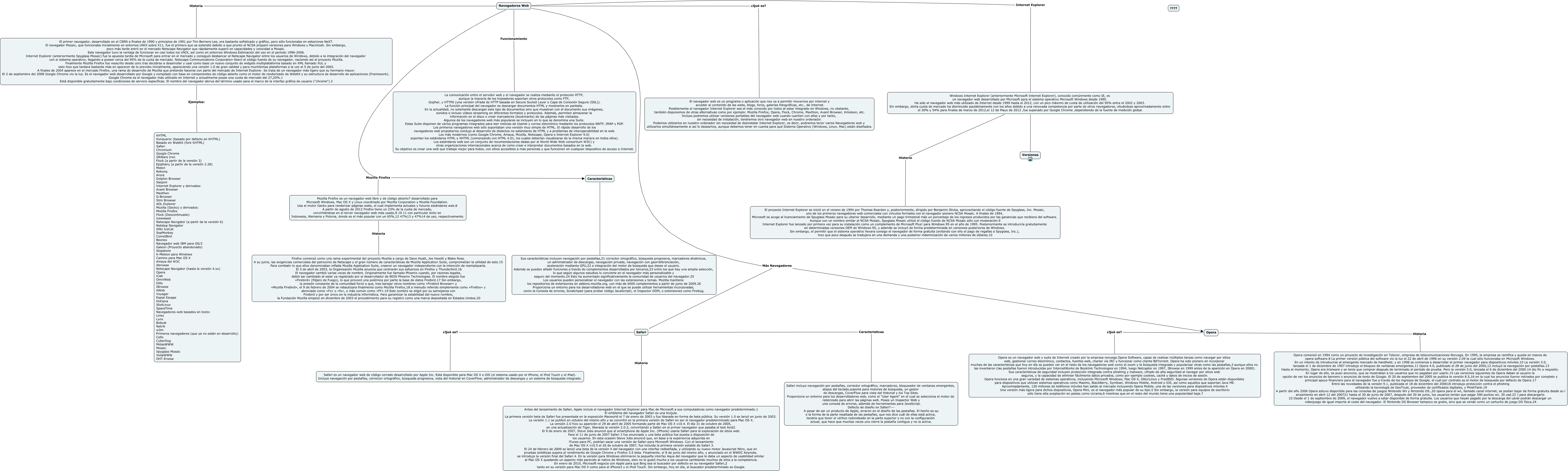 Este Cmap, tiene información relacionada con: SALA_1_PC3_Navegadores web Eduardo Cabello, Opera Historia Opera comenzó en 1994 como un proyecto de investigación en Telenor, empresa de telecomunicaciones Noruega. En 1995, la empresa se ramifica y queda en manos de opera software.8 La primer versión pública del software vio la luz el 22 de abril de 1996 en su versión 2.09 la cual sólo funcionaba en Microsoft Windows. En un intento de introducirse al emergente mercado de handheld; y en 1998 se comienza a desarrollar el primer navegador para dispositivos móviles.10 La versión 3.0, lanzada el 1 de diciembre de 1997 introdujo el bloqueo de ventanas emergentes.11 Opera 4.0, publicado el 28 de junio del 2000,12 incluyó la navegación por pestañas.13 Hasta el momento, Opera era trialware y se tenía que comprar después de terminado el período de prueba. Pero la versión 5.0, lanzada el 6 de diciembre del 2000.14 dio fin a requisito. En lugar de ello, se puso anuncios, que se mostraban a los usuarios que no pagaban por usarlo.15 Las versiones siguientes de Opera daban al usuario la opción de ver los anuncios de banners o anuncios de texto de Google. El 20 de septiembre del 2005 se publica la versión 8.5,16 en la cual los anuncios fueron retirados por completo y principal apoyo financiero para el navegador fue a través de los ingresos de Google, el cual por contrato es el motor de búsqueda por defecto de Opera.17 Entre las novedades de la versión 9.1, publicada el 18 de diciembre del 200618 introdujo protección contra el phishing utilizando la tecnología de GeoTrust, proveedor de certificados digitales, y PhishTank.19 A partir del año 2006 Opera estuvo disponible para las consolas de juegos Nintendo Wii y Nintendo DS.,20 opera para el wii, llamado canal internet, se podían bajar de forma gratuita desde su l anzamiento en abril 12 del 200721 hasta el 30 de junio de 2007, después del 30 de junio, los usuarios tenían que pagar 500 puntos wii, 30 usd.22 ) para descargarlo. 23 Desde el 1 de septiembre de 2009, el navegador vuelve a estar disponible de forma gratuita. Los usuarios que hayan pagado por la descarga del canal podrán descargar un videojuego de igual importe al coste del navegador. El Nintendo DS Browser tampoco es gratis, sino que se vende como un cartucho de juego DS física.24, Safari Caracteristicas Safari incluye navegación por pestañas, corrector ortográfico, marcadores, bloqueador de ventanas emergentes, atajos del teclado,soporte para motores de búsqueda, un gestor de descargas, CoverFlow para vista del historial y los Top Sites. Proporciona un entorno para los desarrolladores web, como el "User Agent" en el cual se selecciona el motor de rederizado para abrir las páginas web. Posee un Inspector Web y una consola de errores, además de herramientas para JavaScript. Defecto de diseño en Safari?--- A pesar de ser un producto de Apple, erraron en el diseño de las pestañas. El hecho es qu e la forma de la parte resaltada de las pestañas, que nos dice cuál de ellas está activa, tendria que tener el vértice redondeado en la parte superior y no con la configuración actual, que hace que muchas veces uno cierre la pestaña contigua y no la activa., Navegadores Web Funcionamiento La comunicación entre el servidor web y el navegador se realiza mediante el protocolo HTTP, aunque la mayoría de los hojeadores soportan otros protocolos como FTP, Gopher, y HTTPS (una versión cifrada de HTTP basada en Secure Socket Layer o Capa de Conexión Segura (SSL)). La función principal del navegador es descargar documentos HTML y mostrarlos en pantalla. En la actualidad, no solamente descargan este tipo de documentos sino que muestran con el documento sus imágenes, sonidos e incluso vídeos streaming en diferentes formatos y protocolos. Además, permiten almacenar la información en el disco o crear marcadores (bookmarks) de las páginas más visitadas. Algunos de los navegadores web más populares se incluyen en lo que se denomina una Suite. Estas Suite disponen de varios programas integrados para leer noticias de Usenet y correo electrónico mediante los protocolos NNTP, IMAP y POP. Los primeros navegadores web sólo soportaban una versión muy simple de HTML. El rápido desarrollo de los navegadores web propietarios condujo al desarrollo de dialectos no estándares de HTML y a problemas de interoperabilidad en la web. Los más modernos (como Google Chrome, Amaya, Mozilla, Netscape, Opera e Internet Explorer 9.0) soportan los estándares HTML y XHTML (comenzando con HTML 4.01, los cuales deberían visualizarse de la misma manera en todos ellos). Los estándares web son un conjunto de recomendaciones dadas por el World Wide Web consortium W3C) y otras organizaciones internacionales acerca de como crear e interpretar documentos basados en la web. Su objetivo es crear una web que trabaje mejor para todos, con sitios accesibles a mas personas y que funcionen en cualquier dispositivo de acceso a Internet., Mozilla Firefox es un navegador web libre y de código abierto7 desarrollado para Microsoft Windows, Mac OS X y Linux coordinado por Mozilla Corporation y Mozilla Foundation. Usa el motor Gecko para renderizar páginas webs, el cual implementa actuales y futuros estándares web.8 A partir de agosto de 2012 Firefox tiene un 23% de la cuota de mercado, convirtiéndose en el tercer navegador web más usado,9 10 11 con particular éxito en Indonesia, Alemania y Polonia, donde es el más popular con un 65%,12 47%13 y 47%14 de uso, respectivamente. Historia Firefox comenzó como una rama experimental del proyecto Mozilla a cargo de Dave Hyatt, Joe Hewitt y Blake Ross. A su juicio, las exigencias comerciales del patrocinio de Netscape y el gran número de características de Mozilla Application Suite, comprometían la utilidad de este.15 Para combatir lo que ellos denominaban inflada Mozilla Application Suite, crearon un navegador independiente con la intención de reemplazarl