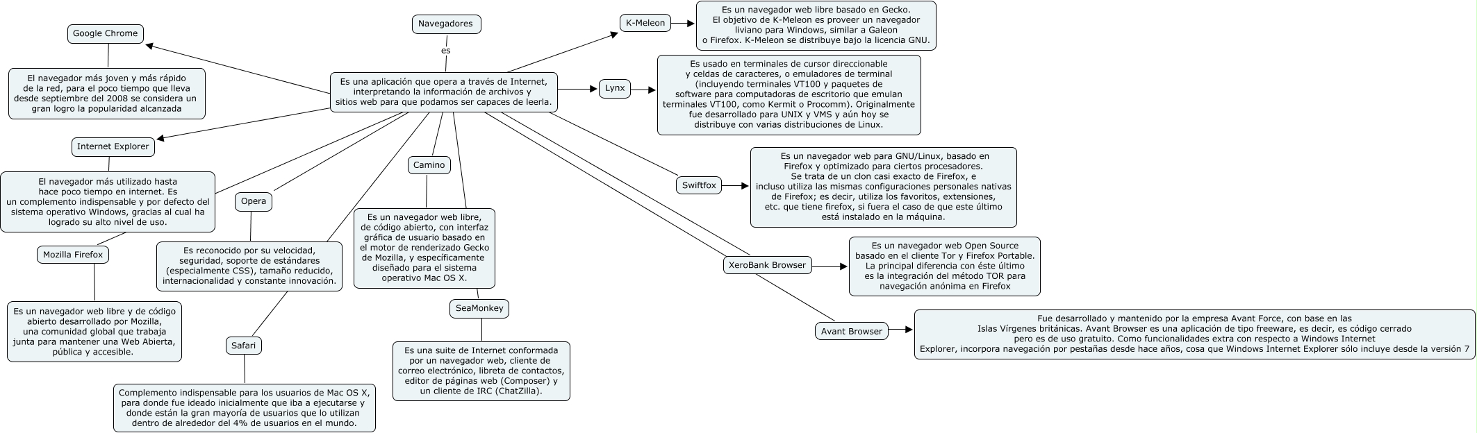 Este Cmap, tiene información relacionada con: SALA_1_PC1_Mapa navegador, Navegadores es Es una aplicación que opera a través de Internet, interpretando la información de archivos y sitios web para que podamos ser capaces de leerla., Camino ???? Es un navegador web libre, de código abierto, con interfaz gráfica de usuario basado en el motor de renderizado Gecko de Mozilla, y específicamente diseñado para el sistema operativo Mac OS X., Google Chrome ???? El navegador más joven y más rápido de la red, para el poco tiempo que lleva desde septiembre del 2008 se considera un gran logro la popularidad alcanzada, Es una aplicación que opera a través de Internet, interpretando la información de archivos y sitios web para que podamos ser capaces de leerla. ???? Safari, XeroBank Browser ???? Es un navegador web Open Source basado en el cliente Tor y Firefox Portable. La principal diferencia con éste último es la integración del método TOR para navegación anónima en Firefox, K-Meleon ???? Es un navegador web libre basado en Gecko. El objetivo de K-Meleon es proveer un navegador liviano para Windows, similar a Galeon o Firefox. K-Meleon se distribuye bajo la licencia GNU., Es una aplicación que opera a través de Internet, interpretando la información de archivos y sitios web para que podamos ser capaces de leerla. ???? Mozilla Firefox, Swiftfox ???? Es un navegador web para GNU/Linux, basado en Firefox y optimizado para ciertos procesadores. Se trata de un clon casi exacto de Firefox, e incluso utiliza las mismas configuraciones personales nativas de Firefox; es decir, utiliza los favoritos, extensiones, etc. que tiene firefox, si fuera el caso de que este último está instalado en la máquina., SeaMonkey ???? Es una suite de Internet conformada por un navegador web, cliente de correo electrónico, libreta de contactos, editor de páginas web (Composer) y un cliente de IRC (ChatZilla)., Es una aplicación que opera a través de Internet, interpretando la información de archivos y sitios web para que podamos ser capaces de leerla. ???? Opera, Internet Explorer ???? El navegador más utilizado hasta hace poco tiempo en internet. Es un complemento indispensable y por defecto del sistema operativo Windows, gracias al cual ha logrado su alto nivel de uso., Safari ???? Complemento indispensable para los usuarios de Mac OS X, para donde fue ideado inicialmente que iba a ejecutarse y donde están la gran mayoría de usuarios que lo utilizan dentro de alrededor del 4% de usuarios en el mundo., Es una aplicación que opera a través de Internet, interpretando la información de archivos y sitios web para que podamos ser capaces de leerla. ???? Camino, Mozilla Firefox ???? Es un navegador web libre y de código abierto desarrollado por Mozilla, una comunidad global que trabaja junta para mantener una Web Abierta, pública y accesible., Lynx ???? Es usado en terminales de cursor direccionable y celdas de caracteres, o emuladores de terminal (incluyendo terminales VT100 y paquetes de software para computadoras de escritorio que emulan terminales VT100, como Kermit o Procomm). Originalmente fue desarrollado para UNIX y VMS y aún hoy se distribuye con varias distribuciones de Linux., Es una aplicación que opera a través de Internet, interpretando la información de archivos y sitios web para que podamos ser capaces de leerla. ???? Internet Explorer, Es una aplicación que opera a través de Internet, interpretando la información de archivos y sitios web para que podamos ser capaces de leerla. ???? K-Meleon, Es una aplicación que opera a través de Internet, interpretando la información de archivos y sitios web para que podamos ser capaces de leerla. ???? Google Chrome, Es una aplicación que opera a través de Internet, interpretando la información de archivos y sitios web para que podamos ser capaces de leerla. ???? XeroBank Browser, Opera ???? Es reconocido por su velocidad, seguridad, soporte de estándares (especialmente CSS), tamaño reducido, internacionalidad y constante innovación.
