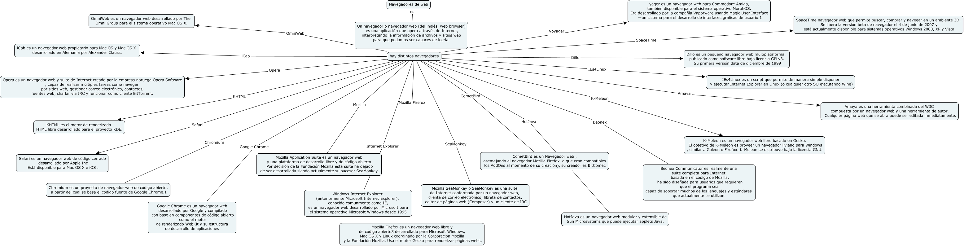 Este Cmap, tiene información relacionada con: SALA_1_PC9_navegadores, hay distintos navegadores Opera Opera es un navegador web y suite de Internet creado por la empresa noruega Opera Software , capaz de realizar múltiples tareas como navegar por sitios web, gestionar correo electrónico, contactos, fuentes web, charlar vía IRC y funcionar como cliente BitTorrent., hay distintos navegadores Beonex Beonex Communicator es realmente una suite completa para Internet, basada en el código de Mozilla, ha sido diseñada para usuarios que requieren que el programa sea capaz de soportar muchos de los lenguajes y estándares que actualmente se utilizan., hay distintos navegadores CometBird CometBird es un Navegador web , asemejando al navegador Mozilla Firefox a que eran compatibles los AddOns al momento de su creación), su creador es BitComet., hay distintos navegadores Safari Safari es un navegador web de código cerrado desarrollado por Apple Inc Está disponible para Mac OS X e iOS ., hay distintos navegadores Internet Explorer Windows Internet Explorer (anteriormente Microsoft Internet Explorer), conocido comúnmente como IE, es un navegador web desarrollado por Microsoft para el sistema operativo Microsoft Windows desde 1995, hay distintos navegadores SpaceTime SpaceTime navegador web que permite buscar, comprar y navegar en un ambiente 3D. Se liberó la versión beta de navegador el 4 de junio de 2007 y está actualmente disponible para sistemas operativos Windows 2000, XP y Vista, hay distintos navegadores Google Chrome Google Chrome es un navegador web desarrollado por Google y compilado con base en componentes de código abierto como el motor de renderizado WebKit y su estructura de desarrollo de aplicaciones, hay distintos navegadores Dillo Dillo es un pequeño navegador web multiplataforma, publicado como software libre bajo licencia GPLv3. Su primera versión data de diciembre de 1999, hay distintos navegadores iCab iCab es un navegador web propietario para Mac OS y Mac OS X desarrollado en Alemania por Alexander Clauss., hay distintos navegadores IEs4Linux IEs4Linux es un script que permite de manera simple disponer y ejecutar Internet Explorer en Linux (o cualquier otro SO ejecutando Wine), hay distintos navegadores Chromium Chromium es un proyecto de navegador web de código abierto, a partir del cual se basa el código fuente de Google Chrome.1, hay distintos navegadores KHTML KHTML es el motor de renderizado HTML libre desarrollado para el proyecto KDE., Navegadores de web es Un navegador o navegador web (del inglés, web browser) es una aplicación que opera a través de Internet, interpretando la información de archivos y sitios web para que podamos ser capaces de leerla, hay distintos navegadores Amaya Amaya es una herramienta combinada del W3C compuesta por un navegador web y una herramienta de autor. Cualquier página web que se abra puede ser editada inmediatamente., hay distintos navegadores HotJava HotJava es un navegador web modular y extensible de Sun Microsystems que puede ejecutar applets Java., hay distintos navegadores K-Meleon K-Meleon es un navegador web libre basado en Gecko. El objetivo de K-Meleon es proveer un navegador liviano para Windows , similar a Galeon o Firefox. K-Meleon se distribuye bajo la licencia GNU., hay distintos navegadores Mozilla Mozilla Application Suite es un navegador web y una plataforma de desarrollo libre y de código abierto. Por decisión de la Fundación Mozilla esta suite ha dejado de ser desarrollada siendo actualmente su sucesor SeaMonkey., hay distintos navegadores Mozilla Firefox Mozilla Firefox es un navegador web libre y de código abierto8 desarrollado para Microsoft Windows, Mac OS X y Linux coordinado por la Corporación Mozilla y la Fundación Mozilla. Usa el motor Gecko para renderizar páginas webs,, hay distintos navegadores OmniWeb OmniWeb es un navegador web desarrollado por The Omni Group para el sistema operativo Mac OS X., hay distintos navegadores SeaMonkey Mozilla SeaMonkey o SeaMonkey es una suite de Internet conformada por un navegador web, cliente de correo electrónico, libreta de contactos, editor de páginas web (Composer) y un cliente de IRC