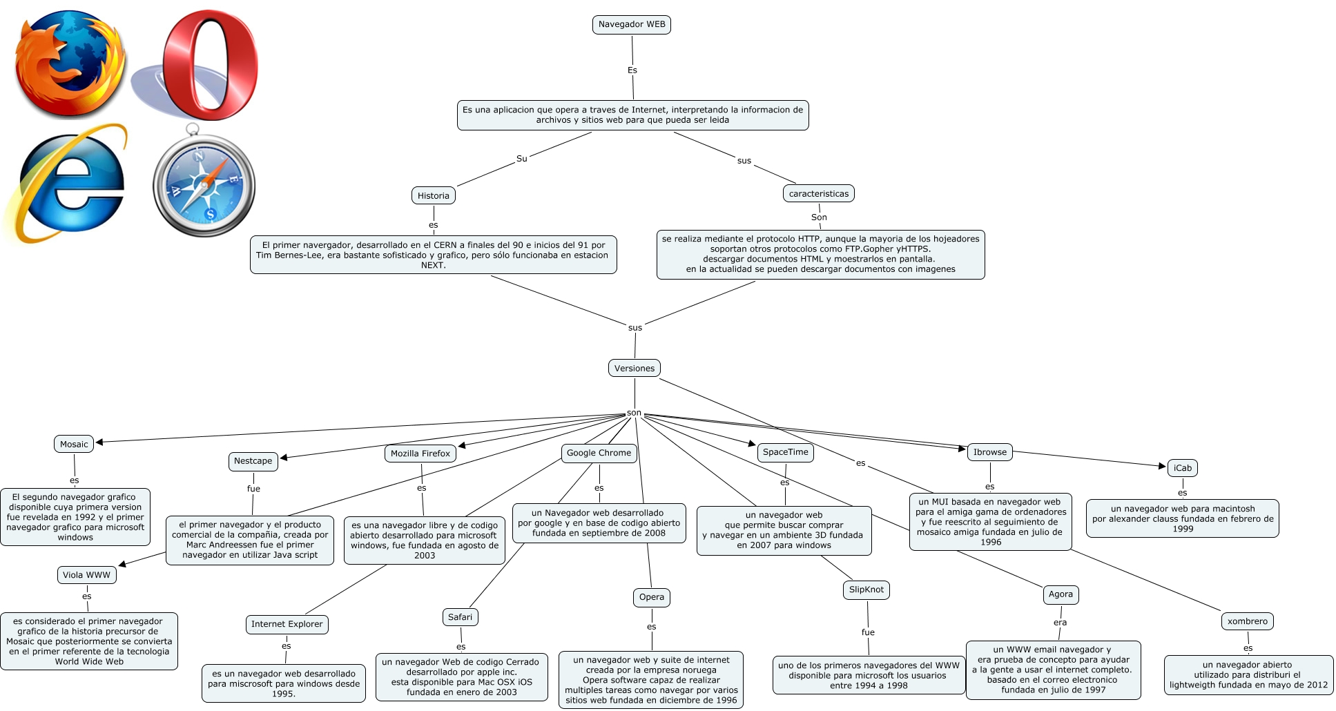 Este Cmap, tiene información relacionada con: SALA_1_PC10_Navegadores web Hiller, Versiones son SlipKnot, Versiones son Viola WWW, Versiones son Safari, Versiones son Google Chrome, Versiones son Mozilla Firefox, Versiones son Ibrowse, Versiones son Mosaic, Viola WWW es es considerado el primer navegador grafico de la historia precursor de Mosaic que posteriormente se convierta en el primer referente de la tecnologia World Wide Web, Navegador WEB Es Es una aplicacion que opera a traves de Internet, interpretando la informacion de archivos y sitios web para que pueda ser leida, Versiones es xombrero, Versiones son Opera, xombrero es un navegador abierto utilizado para distriburi el lightweigth fundada en mayo de 2012, El primer navergador, desarrollado en el CERN a finales del 90 e inicios del 91 por Tim Bernes-Lee, era bastante sofisticado y grafico, pero sólo funcionaba en estacion NEXT. sus Versiones, Agora era un WWW email navegador y era prueba de concepto para ayudar a la gente a usar el internet completo. basado en el correo electronico fundada en julio de 1997, Opera es un navegador web y suite de internet creada por la empresa noruega Opera software capaz de realizar multiples tareas como navegar por varios sitios web fundada en diciembre de 1996, se realiza mediante el protocolo HTTP, aunque la mayoria de los hojeadores soportan otros protocolos como FTP.Gopher yHTTPS. descargar documentos HTML y moestrarlos en pantalla. en la actualidad se pueden descargar documentos con imagenes sus Versiones, Es una aplicacion que opera a traves de Internet, interpretando la informacion de archivos y sitios web para que pueda ser leida sus caracteristicas, SpaceTime es un navegador web que permite buscar comprar y navegar en un ambiente 3D fundada en 2007 para windows, Versiones son iCab, Versiones son Agora
