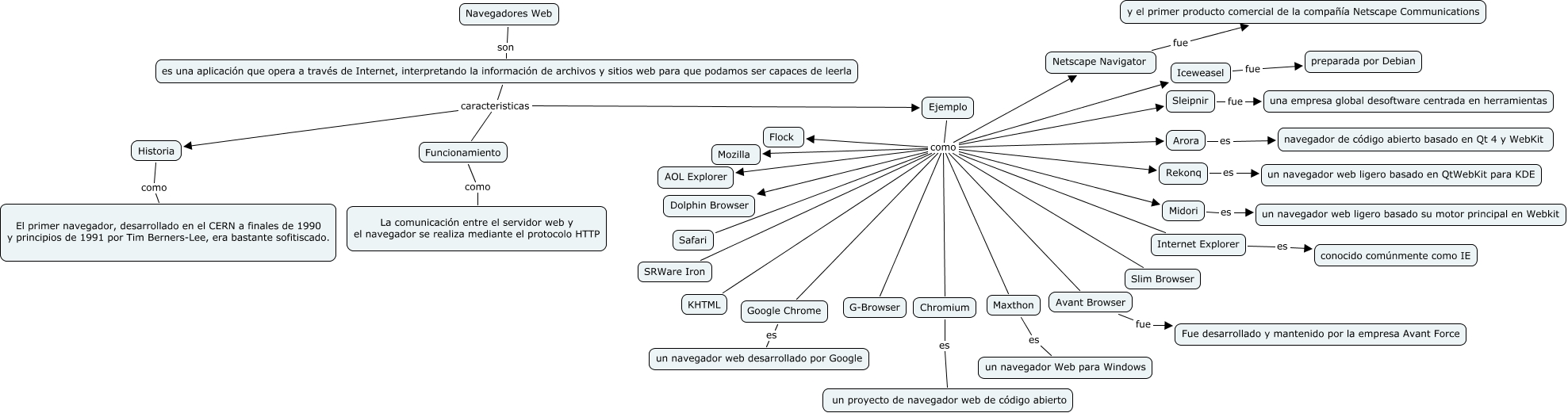 Este Cmap, tiene información relacionada con: SALA_1_PC15_mapa, Ejemplo como Safari, Ejemplo como AOL Explorer, Funcionamiento como La comunicación entre el servidor web y el navegador se realiza mediante el protocolo HTTP, Historia como El primer navegador, desarrollado en el CERN a finales de 1990 y principios de 1991 por Tim Berners-Lee, era bastante sofitiscado., Ejemplo como Maxthon, es una aplicación que opera a través de Internet, interpretando la información de archivos y sitios web para que podamos ser capaces de leerla caracteristicas Historia, Navegadores Web son es una aplicación que opera a través de Internet, interpretando la información de archivos y sitios web para que podamos ser capaces de leerla, Midori es un navegador web ligero basado su motor principal en Webkit, Ejemplo como Mozilla, Ejemplo como Flock, Avant Browser fue Fue desarrollado y mantenido por la empresa Avant Force, Ejemplo como Chromium, Google Chrome es un navegador web desarrollado por Google, Ejemplo como Midori, Ejemplo como Iceweasel, Ejemplo como Sleipnir, Maxthon es un navegador Web para Windows, Internet Explorer es conocido comúnmente como IE, Iceweasel fue preparada por Debian, Rekonq es un navegador web ligero basado en QtWebKit para KDE