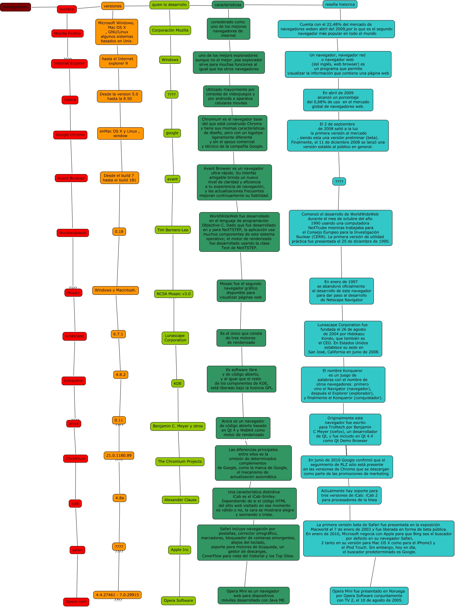 Este Cmap, tiene información relacionada con: SALA_1_PC2_Navegadores, La primera versión beta de Safari fue presentada en la exposición Macworld el 7 de enero de 2003 y fue liberada en forma de beta pública. En enero de 2010, Microsoft negocia con Apple para que Bing sea el buscador por defecto en su navegador Safari, 2 tanto en su versión para Mac OS X como para el iPhone3 y el iPod Touch. Sin embargo, hoy en día, el buscador predeterminado es Google. ???? Opera Mini fue presentado en Noruega por Opera Software conjuntamente con TV 2, el 10 de agosto de 2005., Tim Berners-Lee ???? NCSA Mosaic v3.0, Alexander Clauss ???? Apple Inc, Lunascape Corporation fue fundada el 26 de agosto de 2004 por Hidekazu Kondo, que también es el CEO. En Estados Unidos establece su sede en San José, California en junio de 2008. ???? El nombre Konqueror es un juego de palabras con el nombre de otros navegadores: primero vino el Navigator (navegador), después el Explorer (explorador), y finalmente el Konqueror (conquistador)., google ???? avant, Navegadores. ???? nombre, versiones ???? quien lo desarrollo, icab ???? safari, Utilizado mayormente por consolas de videojuegos y por androids o aparatos celulares moviles ???? Chromium es el navegador base del que está construido Chrome y tiene sus mismas características de diseño, pero con un logotipo ligeramente diferente y sin el apoyo comercial y técnico de la compañía Google., ???? ???? Comenzó el desarrollo de WorldWideWeb durante el mes de octubre del año 1990 usando una computadora NeXTcube mientras trabajaba para el Consejo Europeo para la Investigación Nuclear (CERN). La primera versión de utilidad práctica fue presentada el 25 de diciembre de 1990., quien lo desarrollo ???? Corporación Mozilla, Windows ???? ????, nombre ???? Mozilla Firefox, reseña historica ???? Cuenta con el 22,48% del mercado de navegadores weben abril del 2009,por lo que es el segundo navegador más popular en todo el mundo, Internet Exporer ???? Opera, 4.8a ???? ????, caracteristicas ???? considerado como uno de los mejores navegadores de internet, arora ???? Chromium, Desde el build 7 hasta el build 181 ???? 0.18, Un navegador, navegador red o navegador web (del inglés, web browser) es un programa que permite visualizar la información que contiene una página web ???? En abril de 2009 alcanzó un porcentaje del 0,68% de uso en el mercado global de navegadores web.