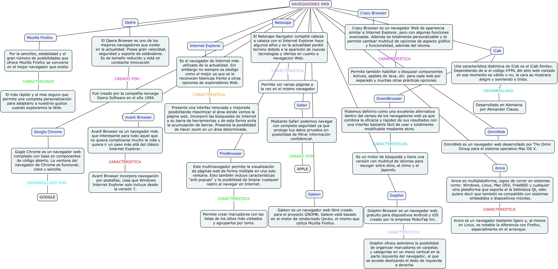 Este Cmap, tiene información relacionada con: SALA_1_PC10_NAVEGACIONES WEB, NAVEGADORES WEB ???? Avant Browser, NAVEGADORES WEB ???? Safari, Avant Browser es un navegador más que interesante para todo aquel que no quiera complicarse mucho la vida y quiera ir un paso más allá del clásico Internet Explorer. CARACTERISTICA Avant Browser incorpora navegación por pestañas, cosa que Windows Internet Explorer solo incluye desde la versión 7., Es el navegador de Internet más utilizado de la actualidad. Sin embargo no siempre es eledigo como el mejor ya que se le reconocen falencias frente a otras opciones de exploradores Web. CARACTERISTICA Presenta una interfaz renovada y mejorada posibilitando maximizar el área donde vemos la página web. Incorporó las búsquedas de Internet a su barra de herramientas y de esta forma evita la acumulación de barras. Presenta la posibilidad de hacer zoom en un área determinada., NAVEGADORES WEB ???? Crazy Browser, Arora es multiplataforma, capaz de correr en sistemas como: Windows, Linux, Mac OSX, FreeBSD y cualquier otra plataforma que soporte el la biblioteca Qt, esto quiere decir que también es compatible con sistemas embedidos o dispositivos móviles. CARACTERISTICA Arora es un navegador bastante ligero y, al menos en Linux, es notable la diferencia con Firefox, especialmente en el arranque., NAVEGADORES WEB ???? Dolphin, GreenBrowser ???? Podemos definirlo como una excelente alternativa dentro del campo de los navegadores web ya que combina la eficacia y rapidez de sus resultados con una interfaz bastante fácil de usar y totalmente modificable mediante skins., Una característica distintiva de iCab es el iCab-Smiley. Dependiendo de si el código HTML del sitio web visitado en ese momento es válido o no, la cara se mostrara alegre y sonriendo o triste. DESARROLLADO Desarrollado en Alemania por Alexander Clauss., FineBrowser ???? Este multinavegador permite la visualización de páginas web de forma múltiple en una sola ventana. Esto también incluye características "anti popups" y la posibilidad de limpiar cualquier rastro al navegar en Internet., Google Chrome ???? Gogle Chrome es un navegador web compilado con base en componentes de código abierto. La ventana del navegador de Chrome es funcional, clara y sencilla., NAVEGADORES WEB ???? OmniWeb, NAVEGADORES WEB ???? GreenBrowser, NAVEGADORES WEB ???? Internet Explorer, Crazy Browser ???? Crazy Browser es un navegador Web de apariencia similar a Internet Explorer, pero con algunas funciones avanzadas. Además es totalmente personalizable y te permite cambiar multitud de opciones de aspecto gráfico y funcionalidad, además del idioma., El Netscape Navigator compitió cabeza a cabeza con el Internet Explorer hace algunos años y en la actualidad perdió terreno debido a la aparición de nuevas tecnologías y ofertas en cuanto a navegacion Web. CARACTERISTICA Permite ver varias páginas a la vez en el mismo navegador, NAVEGADORES WEB ???? iCab, Internet Explorer ???? Es el navegador de Internet más utilizado de la actualidad. Sin embargo no siempre es eledigo como el mejor ya que se le reconocen falencias frente a otras opciones de exploradores Web., Podemos definirlo como una excelente alternativa dentro del campo de los navegadores web ya que combina la eficacia y rapidez de sus resultados con una interfaz bastante fácil de usar y totalmente modificable mediante skins. CARACTERISTICAS Es un motor de búsqueda y tiene una versión con multitud de idiomas para escoger entre ellos, el chino y el japonés., Gogle Chrome es un navegador web compilado con base en componentes de código abierto. La ventana del navegador de Chrome es funcional, clara y sencilla. DESARROLLADO POR: GOOGLE