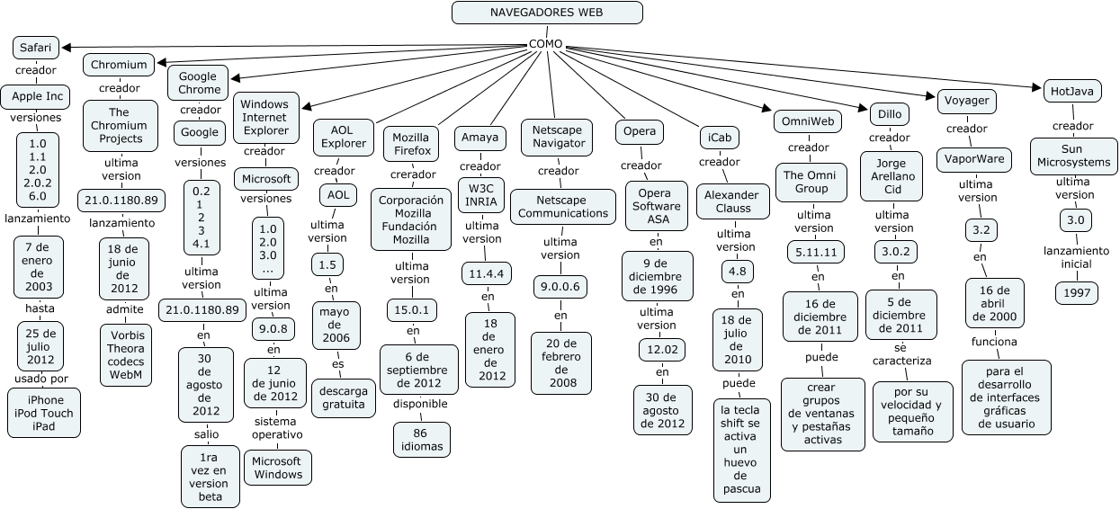 Este Cmap, tiene información relacionada con: SALA_1_PC23_navegadores, 21.0.1180.89 lanzamiento 18 de junio de 2012, Mozilla Firefox crerador Corporación Mozilla Fundación Mozilla, 21.0.1180.89 en 30 de agosto de 2012, 25 de julio 2012 usado por iPhone iPod Touch iPad, iCab creador Alexander Clauss, Opera Software ASA en 9 de diciembre de 1996, Jorge Arellano Cid ultima version 3.0.2, Windows Internet Explorer creador Microsoft, 18 de junio de 2012 admite Vorbis Theora codecs WebM, 11.4.4 en 18 de enero de 2012, NAVEGADORES WEB COMO Windows Internet Explorer, Dillo creador Jorge Arellano Cid, NAVEGADORES WEB COMO Voyager, 12.02 en 30 de agosto de 2012, NAVEGADORES WEB COMO AOL Explorer, Chromium creador The Chromium Projects, 5.11.11 en 16 de diciembre de 2011, NAVEGADORES WEB COMO Opera, OmniWeb creador The Omni Group, Google versiones 0.2 1 2 3 4.1