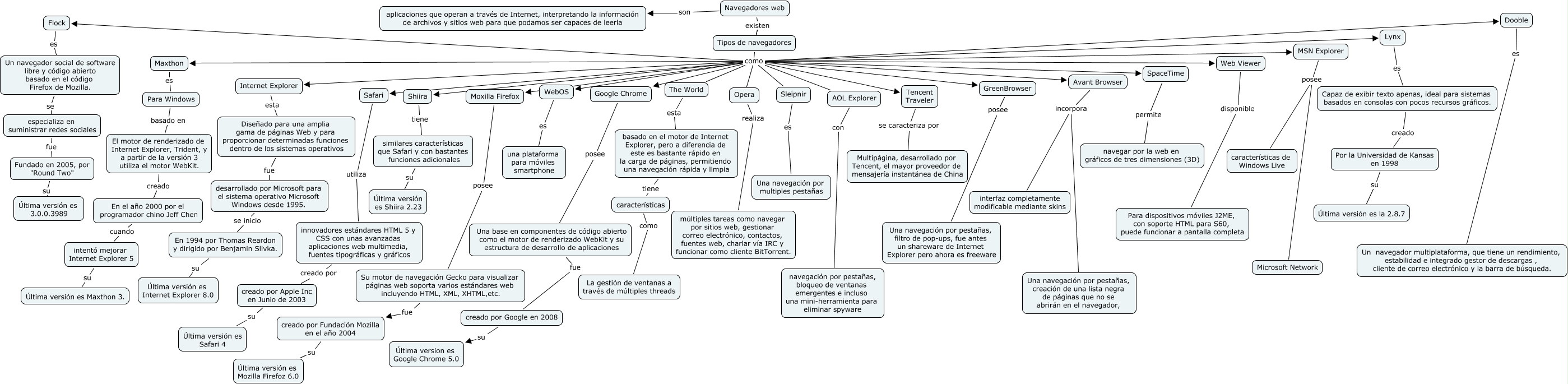 Este Cmap, tiene información relacionada con: SALA_1_PC12_Navegadores web, Flock es Un navegador social de software libre y código abierto basado en el código Firefox de Mozilla., Sleipnir es Una navegación por multiples pestañas, creado por Google en 2008 su Última version es Google Chrome 5.0, Safari utiliza innovadores estándares HTML 5 y CSS con unas avanzadas aplicaciones web multimedia, fuentes tipográficas y gráficos, Diseñado para una amplia gama de páginas Web y para proporcionar determinadas funciones dentro de los sistemas operativos fue desarrollado por Microsoft para el sistema operativo Microsoft Windows desde 1995., Tipos de navegadores como SpaceTime, Tipos de navegadores como AOL Explorer, Tencent Traveler se caracteriza por Multipágina, desarrollado por Tencent, el mayor proveedor de mensajería instantánea de China, En 1994 por Thomas Reardon y dirigido por Benjamin Slivka. su Última versión es Internet Explorer 8.0, Tipos de navegadores como Lynx, Un navegador social de software libre y código abierto basado en el código Firefox de Mozilla. se especializa en suministrar redes sociales, Tipos de navegadores como Moxilla Firefox, Avant Browser incorpora Una navegación por pestañas, creación de una lista negra de páginas que no se abrirán en el navegador,, WebOS es una plataforma para móviles smartphone, Navegadores web existen Tipos de navegadores, MSN Explorer posee características de Windows Live, SpaceTime permite navegar por la web en gráficos de tres dimensiones (3D), Por la Universidad de Kansas en 1998 su Última versión es la 2.8.7, Maxthon es Para Windows, creado por Fundación Mozilla en el año 2004 su Última versión es Mozilla Firefoz 6.0