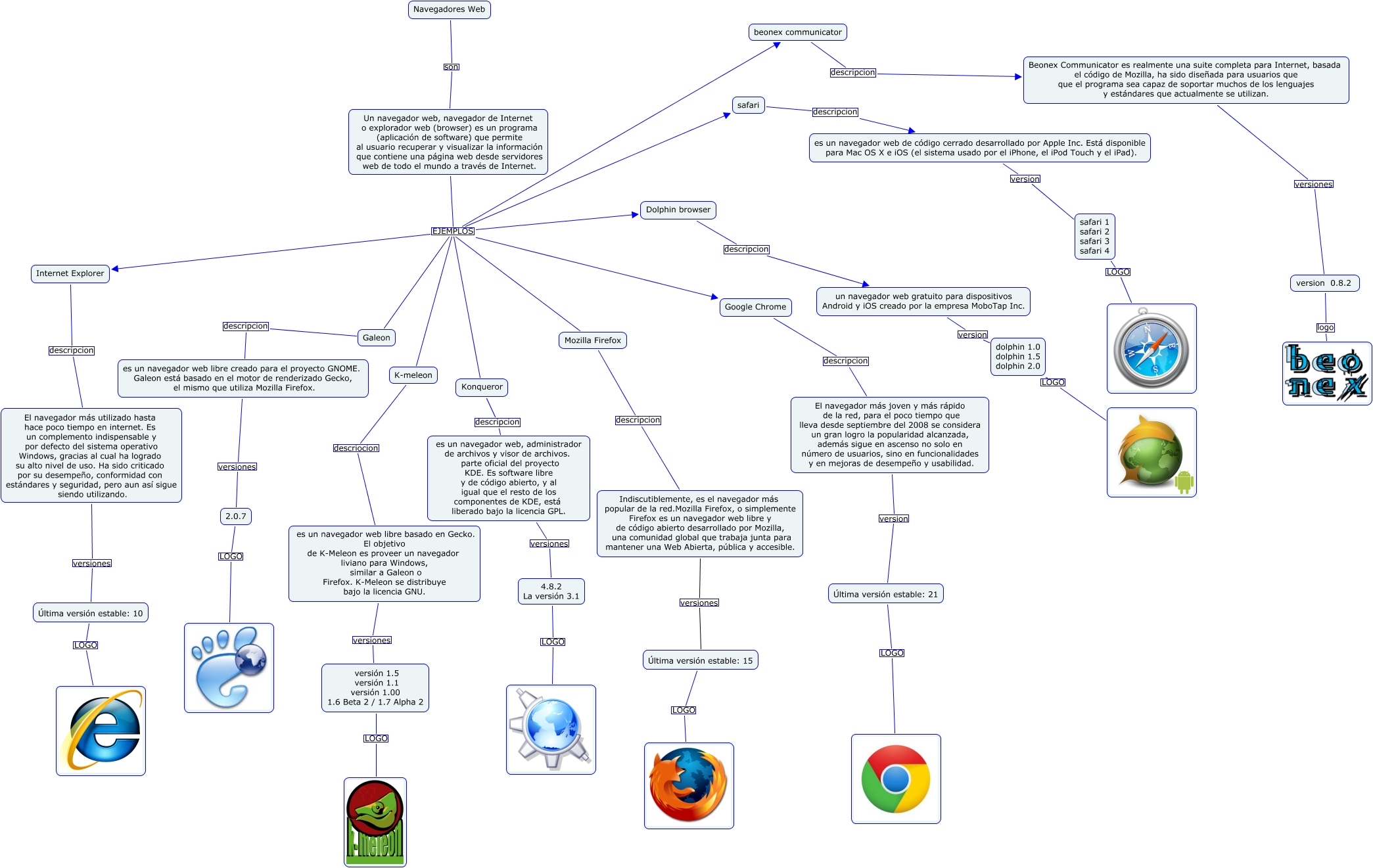 Este Cmap, tiene información relacionada con: SALA_1_PC21_navegadores web 111, Konqueror descripcion es un navegador web, administrador de archivos y visor de archivos. parte oficial del proyecto KDE. Es software libre y de código abierto, y al igual que el resto de los componentes de KDE, está liberado bajo la licencia GPL., version 0.8.2 logo, K-meleon EJEMPLOS Internet Explorer, Mozilla Firefox EJEMPLOS Internet Explorer, K-meleon EJEMPLOS Google Chrome, Galeon EJEMPLOS safari, El navegador más utilizado hasta hace poco tiempo en internet. Es un complemento indispensable y por defecto del sistema operativo Windows, gracias al cual ha logrado su alto nivel de uso. Ha sido criticado por su desempeño, conformidad con estándares y seguridad, pero aun así sigue siendo utilizando. versiones Última versión estable: 10, dolphin 1.0 dolphin 1.5 dolphin 2.0 LOGO, Última versión estable: 21 LOGO, Google Chrome descripcion El navegador más joven y más rápido de la red, para el poco tiempo que lleva desde septiembre del 2008 se considera un gran logro la popularidad alcanzada, además sigue en ascenso no solo en número de usuarios, sino en funcionalidades y en mejoras de desempeño y usabilidad., K-meleon descriocion es un navegador web libre basado en Gecko. El objetivo de K-Meleon es proveer un navegador liviano para Windows, similar a Galeon o Firefox. K-Meleon se distribuye bajo la licencia GNU., un navegador web gratuito para dispositivos Android y iOS creado por la empresa MoboTap Inc. version dolphin 1.0 dolphin 1.5 dolphin 2.0, safari descripcion es un navegador web de código cerrado desarrollado por Apple Inc. Está disponible para Mac OS X e iOS (el sistema usado por el iPhone, el iPod Touch y el iPad)., Navegadores Web son Un navegador web, navegador de Internet o explorador web (browser) es un programa (aplicación de software) que permite al usuario recuperar y visualizar la información que contiene una página web desde servidores web de todo el mundo a través de Internet., Galeon EJEMPLOS Internet Explorer, Un navegador web, navegador de Internet o explorador web (browser) es un programa (aplicación de software) que permite al usuario recuperar y visualizar la información que contiene una página web desde servidores web de todo el mundo a través de Internet. EJEMPLOS Dolphin browser, 4.8.2 La versión 3.1 LOGO, Konqueror EJEMPLOS safari, Konqueror EJEMPLOS beonex communicator, Dolphin browser descripcion un navegador web gratuito para dispositivos Android y iOS creado por la empresa MoboTap Inc.