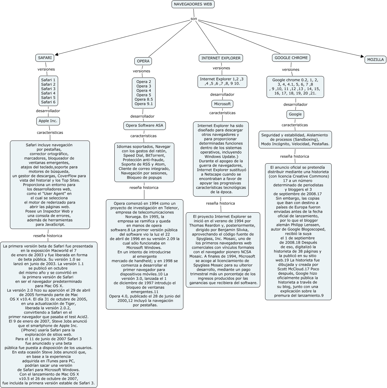 Este Cmap, tiene información relacionada con: SALA_1_PC25_NAVEGADORES WEB, Apple Inc. caracteristicas Safari incluye navegación por pestañas, corrector ortográfico, marcadores, bloqueador de ventanas emergentes, atajos del teclado,soporte para motores de búsqueda, un gestor de descargas, CoverFlow para vista del historial y los Top Sites. Proporciona un entorno para los desarrolladores web, como el "User Agent" en el cual se selecciona el motor de rederizado para abrir las páginas web. Posee un Inspector Web y una consola de errores, además de herramientas para JavaScript., NAVEGADORES WEB son OPERA, Microsoft caracteristicas Internet Explorer ha sido diseñado para descargar otros navegadores y para proporcionar determinadas funciones dentro de los sistemas operativos, incluyendo Windows Update.} Durante el apogeo de la guerra de navegadores, Internet Explorer sustituyó a Netscape cuando se encontraban a favor de apoyar las progresivas características tecnológicas de la época., NAVEGADORES WEB son MOZILLA, Safari 1 Safari 2 Safari 3 Safari 4 Safari 5 Safari 6 desarrollador Apple Inc., OPERA versiones Opera 2 Opera 3 Opera 4 Opera 5 Opera 8.5 Opera 9.1, Idiomas soportados, Navegar con los gestos del ratón, Speed Dial, BitTorrent, Protección anti-fraude, Soporte de RSS y Atom, Cliente de correo integrado, Navegación por sesiones, Bloqueo de popups reseña historica Opera comenzó en 1994 como un proyecto de investigación en Telenor, empresa de telecomunicaciones Noruega. En 1995, la empresa se ramifica y queda en manos de opera software.8 La primer versión pública del software vio la luz el 22 de abril de 1996 en su versión 2.09 la cual sólo funcionaba en Microsoft Windows. En un intento de introducirse al emergente mercado de handheld; y en 1998 se comienza a desarrollar el primer navegador para dispositivos móviles.10 La versión 3.0, lanzada el 1 de diciembre de 1997 introdujo el bloqueo de ventanas emergentes.11 Opera 4.0, publicado el 28 de junio del 2000,12 incluyó la navegación por pestañas., INTERNET EXPLORER versiones Internet Explorer 1,2 ,3 ,4 ,5 ,6 ,7 ,8, 9 10., NAVEGADORES WEB son GOOGLE CHROME, Safari incluye navegación por pestañas, corrector ortográfico, marcadores, bloqueador de ventanas emergentes, atajos del teclado,soporte para motores de búsqueda, un gestor de descargas, CoverFlow para vista del historial y los Top Sites. Proporciona un entorno para los desarrolladores web, como el "User Agent" en el cual se selecciona el motor de rederizado para abrir las páginas web. Posee un Inspector Web y una consola de errores, además de herramientas para JavaScript. reseña historica La primera versión beta de Safari fue presentada en la exposición Macworld el 7 de enero de 2003 y fue liberada en forma de beta pública. Su versión 1.0 se lanzó en junio de 2003. La versión 1.1 se publicó en octubre del mismo año y se convirtió en la primera versión de Safari en ser el navegador predeterminado para Mac OS X. La versión 2.0 hizo su aparición el 29 de abril de 2005 formando parte de Mac OS X v10.4. El día 31 de octubre de 2005, en una actualización de Tiger, liberada la versión 2.0.2, convirtiendo a Safari en el primer navegador que pasaba el test Acid2. El 9 de enero de 2007, Steve Jobs anunció que el smartphone de Apple Inc. (iPhone) usaría Safari para la exploración de sitios web. Para el 11 de junio de 2007 Safari 3 fue anunciado y una beta pública fue puesta a disposición de los usuarios. En esta ocasión Steve Jobs anunció que, en base a la experiencia adquirida en iTunes para PC, podrían sacar una versión de Safari para Microsoft Windows. Con el lanzamiento de Mac OS X v10.5 el 26 de octubre de 2007, fue incluida la primera versión estable de Safari 3., NAVEGADORES WEB son SAFARI, Opera Software ASA caracteristicas Idiomas soportados, Navegar con los gestos del ratón, Speed Dial, BitTorrent, Protección anti-fraude, Soporte de RSS y Atom, Cliente de correo integrado, Navegación por sesiones, Bloqueo de popups, GOOGLE CHROME versiones Google chrome 0.2, 1, 2, 3, 4, 4.1, 5, 6, 7 ,8 , 9 ,10, 11 ,12 ,13 , 14, 15, 16, 17, 18, 19, 20 ,21., Opera 2 Opera 3 Opera 4 Opera 5 Opera 8.5 Opera 9.1 desarrollador Opera Software ASA, Internet Explorer 1,2 ,3 ,4 ,5 ,6 ,7 ,8, 9 10. desarrollador Microsoft, Google caracteristicas Seguridad y estabilidad, Aislamiento de procesos (Sandboxing), Modo Incógnito, Velocidad, Pestañas., NAVEGADORES WEB son INTERNET EXPLORER, SAFARI versiones Safari 1 Safari 2 Safari 3 Safari 4 Safari 5 Safari 6, Internet Explorer ha sido diseñado para descargar otros navegadores y para proporcionar determinadas funciones dentro de los sistemas operativos, incluyendo Windows Update.} Durante el apogeo de la guerra de navegadores, Internet Explorer sustituyó a Netscape cuando se encontraban a favor de apoyar las progresivas características tecnológicas de la época. reseña historica El proyecto Internet Explorer se inició en el verano de 1994 por Thomas Reardon y, posteriormente, dirigido por Benjamin Slivka, aprovechando el código fuente de Spyglass, Inc. Mosaic, uno de los primeros navegadores web comerciales con vínculos formales con el navegador pionero NCSA Mosaic. A finales de 1994, Microsoft se acoge al licenciamiento de Spyglass Mosaic para su ulterior desarrollo, mediante un pago trimestral más un porcentaje de los ingresos producidos por las ganancias que recibiera del software., Seguridad y estabilidad, Aislamiento de procesos (Sandboxing), Modo Incógnito, Velocidad, Pestañas. reseña historica El anuncio oficial se pretendía distribuir mediante una historieta (con licencia Creative Commons) 17 a un número determinado de periodistas y bloggers el 3 de septiembre de 2008.17 Sin embargo, las copias que iban con destino a países de Europa fueron enviadas antes de la fecha oficial de lanzamiento, por lo que el blogger alemán Philipp Lenssen, autor de Google Blogoscoped, recibió la suya el 1 d