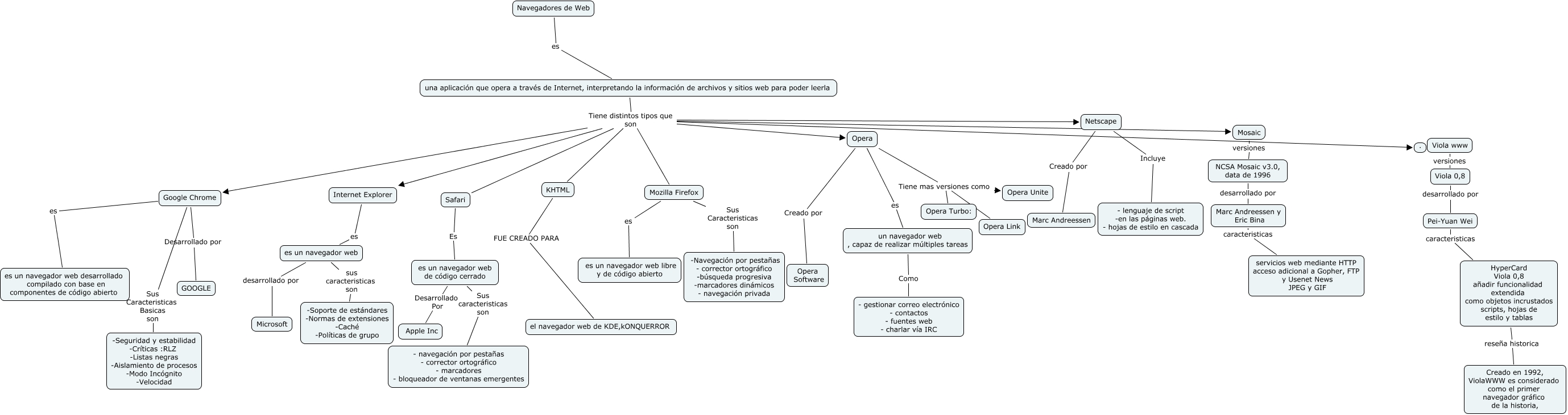 Este Cmap, tiene información relacionada con: SALA_1_PC10_Mapa de navegadores, es un navegador web de código cerrado Sus caracteristicas son - navegación por pestañas - corrector ortográfico - marcadores - bloqueador de ventanas emergentes, una aplicación que opera a través de Internet, interpretando la información de archivos y sitios web para poder leerla Tiene distintos tipos que son Mosaic, una aplicación que opera a través de Internet, interpretando la información de archivos y sitios web para poder leerla Tiene distintos tipos que son Google Chrome, Pei-Yuan Wei caracteristicas HyperCard Viola 0,8 añadir funcionalidad extendida como objetos incrustados scripts, hojas de estilo y tablas, Opera Tiene mas versiones como Opera Link, una aplicación que opera a través de Internet, interpretando la información de archivos y sitios web para poder leerla Tiene distintos tipos que son ., Netscape Incluye - lenguaje de script -en las páginas web. - hojas de estilo en cascada, Opera Creado por Opera Software, Google Chrome es es un navegador web desarrollado compilado con base en componentes de código abierto, Opera Tiene mas versiones como Opera Turbo:, Netscape Creado por Marc Andreessen, Viola www versiones Viola 0,8, Mozilla Firefox Sus Caracteristicas son -Navegación por pestañas - corrector ortográfico -búsqueda progresiva -marcadores dinámicos - navegación privada, una aplicación que opera a través de Internet, interpretando la información de archivos y sitios web para poder leerla Tiene distintos tipos que son Netscape, Marc Andreessen y Eric Bina caracteristicas servicios web mediante HTTP acceso adicional a Gopher, FTP y Usenet News JPEG y GIF, es un navegador web de código cerrado Desarrollado Por Apple Inc, es un navegador web sus caracteristicas son -Soporte de estándares -Normas de extensiones -Caché -Políticas de grupo, HyperCard Viola 0,8 añadir funcionalidad extendida como objetos incrustados scripts, hojas de estilo y tablas reseña historica Creado en 1992, ViolaWWW es considerado como el primer navegador gráfico de la historia,, KHTML FUE CREADO PARA el navegador web de KDE,kONQUERROR, Google Chrome Desarrollado por GOOGLE