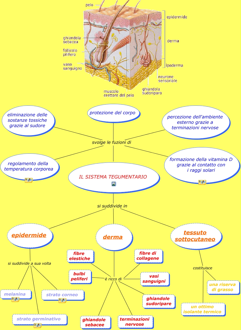 Questa Cmap, creata con IHMC CmapTools, contiene informazioni relative a: il sistema tegumentario, derma è ricco di ghiandole sudoripare, derma è ricco di terminazioni nervose, derma è ricco di fibre di collagene, derma è ricco di fibre elestiche, tessuto sottocutaneo costituisce un ottimo isolante termico, IL SISTEMA TEGUMENTARIO si suddivide in tessuto sottocutaneo, IL SISTEMA TEGUMENTARIO svolge le fuzioni di formazione della vitamina D grazie al contatto con i raggi solari, epidermide si suddivide a sua volta melanina, tessuto sottocutaneo costituisce una riserva di grasso, epidermide si suddivide a sua volta strato corneo, IL SISTEMA TEGUMENTARIO svolge le fuzioni di regolamento della temperatura corporea, derma è ricco di ghiandole sebacee, IL SISTEMA TEGUMENTARIO svolge le fuzioni di percezione dell'ambiente esterno grazie a terminazioni nervose, IL SISTEMA TEGUMENTARIO si suddivide in derma, derma è ricco di vasi sanguigni, IL SISTEMA TEGUMENTARIO si suddivide in epidermide, IL SISTEMA TEGUMENTARIO svolge le fuzioni di eliminazione delle sostanze tossiche grazie al sudore, epidermide si suddivide a sua volta strato germinativo, IL SISTEMA TEGUMENTARIO svolge le fuzioni di protezione del corpo, derma è ricco di bulbi peliferi