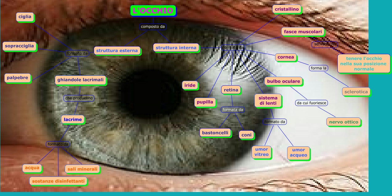 Questa Cmap, creata con IHMC CmapTools, contiene informazioni relative a: occhio, bulbo oculare da cui fuoriesce nervo ottico, struttura interna formato da fasce muscolari, retina formata da coni, struttura interna formato da pupilla, struttura esterna formato da sopracciglia, struttura esterna formato da ghiandole lacrimali, retina formata da bastoncelli, sistema di lenti formato da umor acqueo, struttura interna formato da retina, cornea forma la sclerotica, ghiandole lacrimali che producono lacrime, fasce muscolari servono per tenere l'occhio nella sua posizione normale, lacrime formato da sali minerali, struttura interna formato da cristallino, struttura esterna formato da palpebre, struttura interna formato da sistema di lenti, L'OCCHIO composto da struttura interna, sistema di lenti formato da umor vitreo, struttura esterna formato da ciglia, struttura interna formato da bulbo oculare