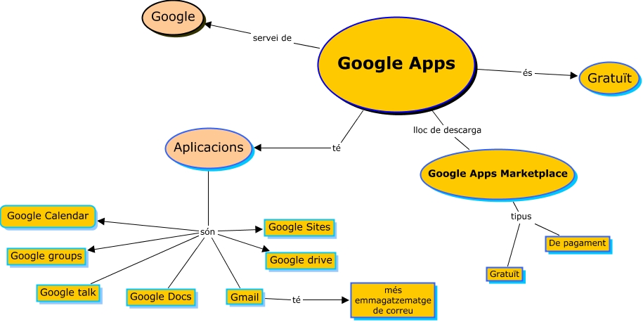 Aquest mapa conceptual conté informació relacionada amb: Google Apps, Aplicacions són Google groups, Aplicacions són Google Docs, Google Apps Marketplace tipus Gratuït, Gmail té més emmagatzematge de correu, Aplicacions són Google drive, Google Apps Marketplace tipus De pagament, Google Apps és Gratuït, Aplicacions són Google Sites, Google Apps té Aplicacions, Aplicacions són Google talk, Aplicacions són Google Calendar, Aplicacions són Gmail, Google Apps servei de Google, Google Apps lloc de descarga Google Apps Marketplace
