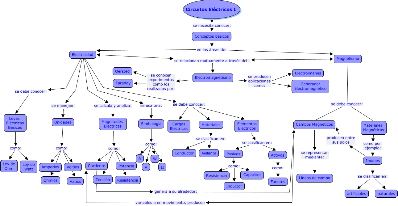 Este Cmap, tiene información relacionada con: mapa conceptual circuitos electricos I, Electricidad se manejan: Unidades, Leyes Eléctricas Básicas como: Ley de Ohm, Magnitudes Electricas como: Potencia, Electromagnetismo se conocen experimentos como los realizados por: Oersted, Materiales se clasifican en: Conductor, Conceptos básicos en las áreas de: Electricidad, Pasivos como: Inductor, Imanes se clasifican en: artificiales, Conceptos básicos en las áreas de: Magnetismo, Imanes producen entre sus polos Campos Magneticos, Electricidad se calcula y analiza: Magnitudes Electricas, Elementos Eléctricos se clasifican en: Pasivos, Activos como: Fuentes, Electromagnetismo se conocen experimentos como los realizados por: Faraday, Magnitudes Electricas como: Tensión, Simbología como: Ω, Electromagnetismo se producen aplicaciones como: Electroimanes, Campos Magneticos variables o en movimiento, producen Corriente, Unidades como: Amperios, Magnetismo se relacionan mutuamente a través del: Electricidad