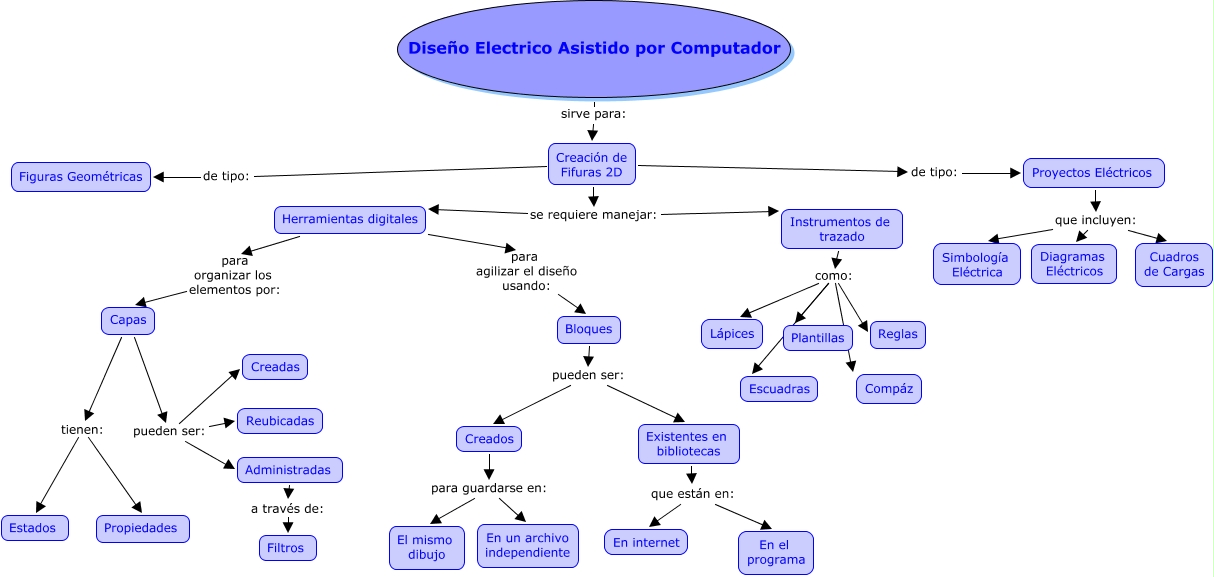 Este Cmap, tiene información relacionada con: mapa conceptual diseño electrico asistido por PC_taller3, Creados para guardarse en: En un archivo independiente, Instrumentos de trazado como: Reglas, Creación de Fifuras 2D se requiere manejar: Instrumentos de trazado, Bloques pueden ser: Creados, Proyectos Eléctricos que incluyen: Simbología Eléctrica, Capas tienen: Estados, Capas pueden ser: Creadas, Instrumentos de trazado como: Lápices, Instrumentos de trazado como: Escuadras, Existentes en bibliotecas que están en: En el programa, Herramientas digitales para organizar los elementos por: Capas, Creación de Fifuras 2D de tipo: Proyectos Eléctricos, Creación de Fifuras 2D de tipo: Figuras Geométricas, Existentes en bibliotecas que están en: En internet, Herramientas digitales para agilizar el diseño usando: Bloques, Instrumentos de trazado como: Plantillas, Creados para guardarse en: El mismo dibujo, Proyectos Eléctricos que incluyen: Diagramas Eléctricos, Instrumentos de trazado como: Compáz, Capas pueden ser: Reubicadas
