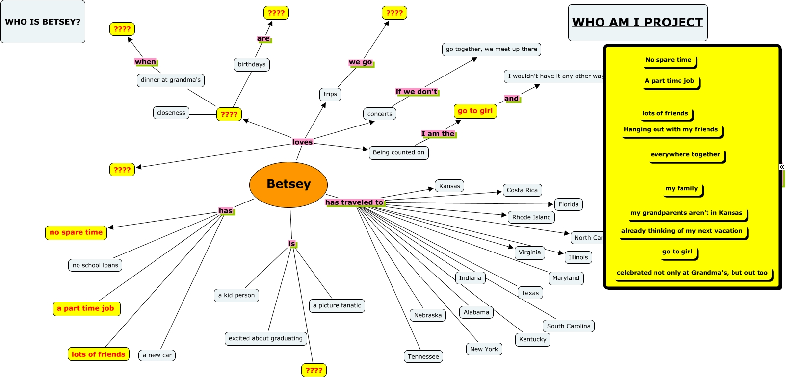 This Concept Map, created with IHMC CmapTools, has information related to: BETSEY_WHO AM I, go to girl and I wouldn't have it any other way, Betsey is a picture fanatic, Betsey has traveled to Tennessee, Betsey has traveled to Florida, Betsey has traveled to Texas, ???? ???? dinner at grandma's, Betsey has traveled to Illinois, Being counted on I am the go to girl, Betsey loves ????, Betsey has traveled to New York, Betsey has traveled to North Carolina, Betsey has traveled to Nebraska, Betsey has a part time job, Betsey is ????, Betsey has traveled to Maryland, Betsey has no school loans, Betsey has traveled to Rhode Island, dinner at grandma's when ????, Betsey has traveled to Virginia, Betsey has traveled to Kentucky