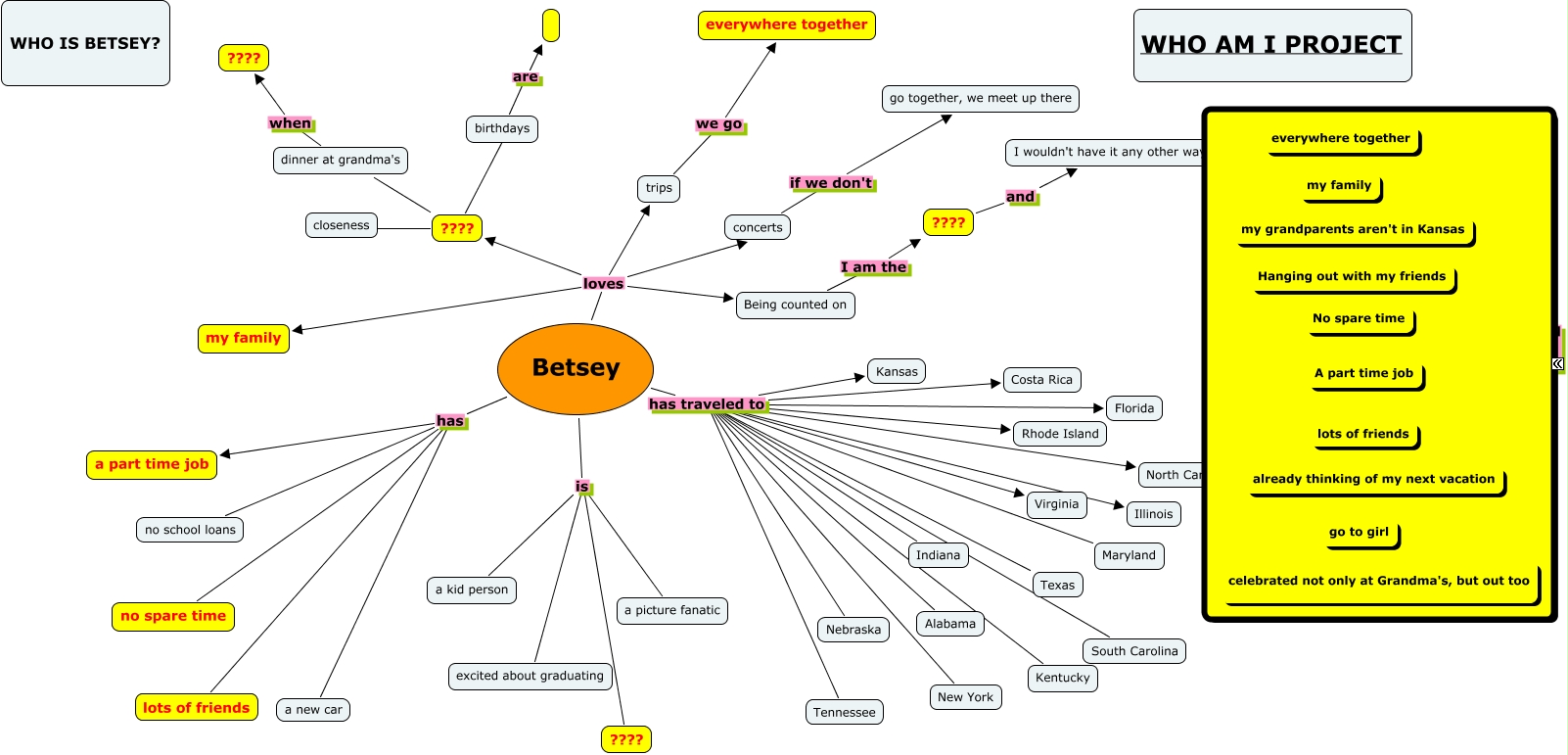 This Concept Map, created with IHMC CmapTools, has information related to: BETSEY_WHO AM I, ???? and I wouldn't have it any other way, Betsey is a picture fanatic, ???? ???? dinner at grandma's, Betsey has traveled to Texas, Betsey has traveled to Florida, Betsey has traveled to Tennessee, Betsey has traveled to Illinois, Being counted on I am the ????, Betsey loves ????, Betsey has traveled to North Carolina, Betsey has traveled to New York, Betsey has traveled to Nebraska, Betsey has no spare time, Betsey has no school loans, Betsey has traveled to Maryland, Betsey is ????, Betsey has traveled to Rhode Island, dinner at grandma's when ????, Betsey has traveled to Kentucky, Betsey has traveled to Virginia