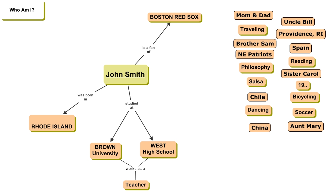This Concept Map, created with IHMC CmapTools, has information related to: JOHN SMITH WHO AM i, John Smith was born in RHODE ISLAND, WEST High School works as a Teacher, John Smith studied at WEST High School, BROWN University works as a Teacher, John Smith is a fan of BOSTON RED SOX, John Smith studied at BROWN University