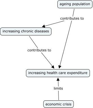 Questa Cmap, creata con IHMC CmapTools, contiene informazioni relative a: Socio economic facts, ageing population contributes to increasing chronic diseases, ageing population contributes to increasing health care expenditure, economic crisis limits increasing health care expenditure, increasing chronic diseases contributes to increasing health care expenditure